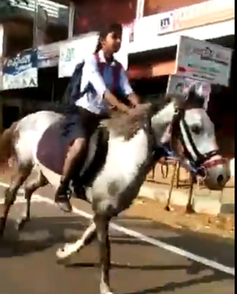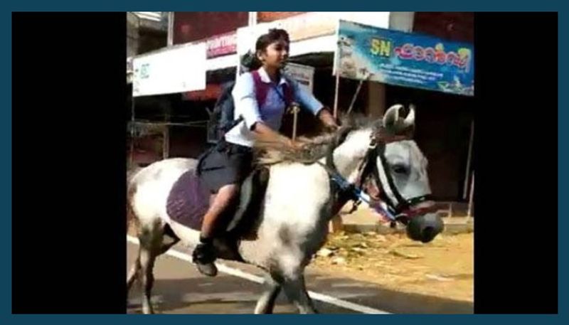 கேரள மாநிலம் திருச்சூரை சேர்ந்த கிருஷ்ணா என்ற பெண் பத்தாம் வகுப்பு தேர்வு எழுத புத்தக பையுடன் சீருடையில், தான் வளர்த்து வந்த குதிரை மீது அமர்ந்து அசுரவேகத்தில் ஓட்டி சென்றார். இதனை சாலையில் சென்ற மற்றவர்கள் வீடியோவாக எடுத்து சமூக வலைத்தளத்தில் பதிவிட அது வைரல் ஆனது.