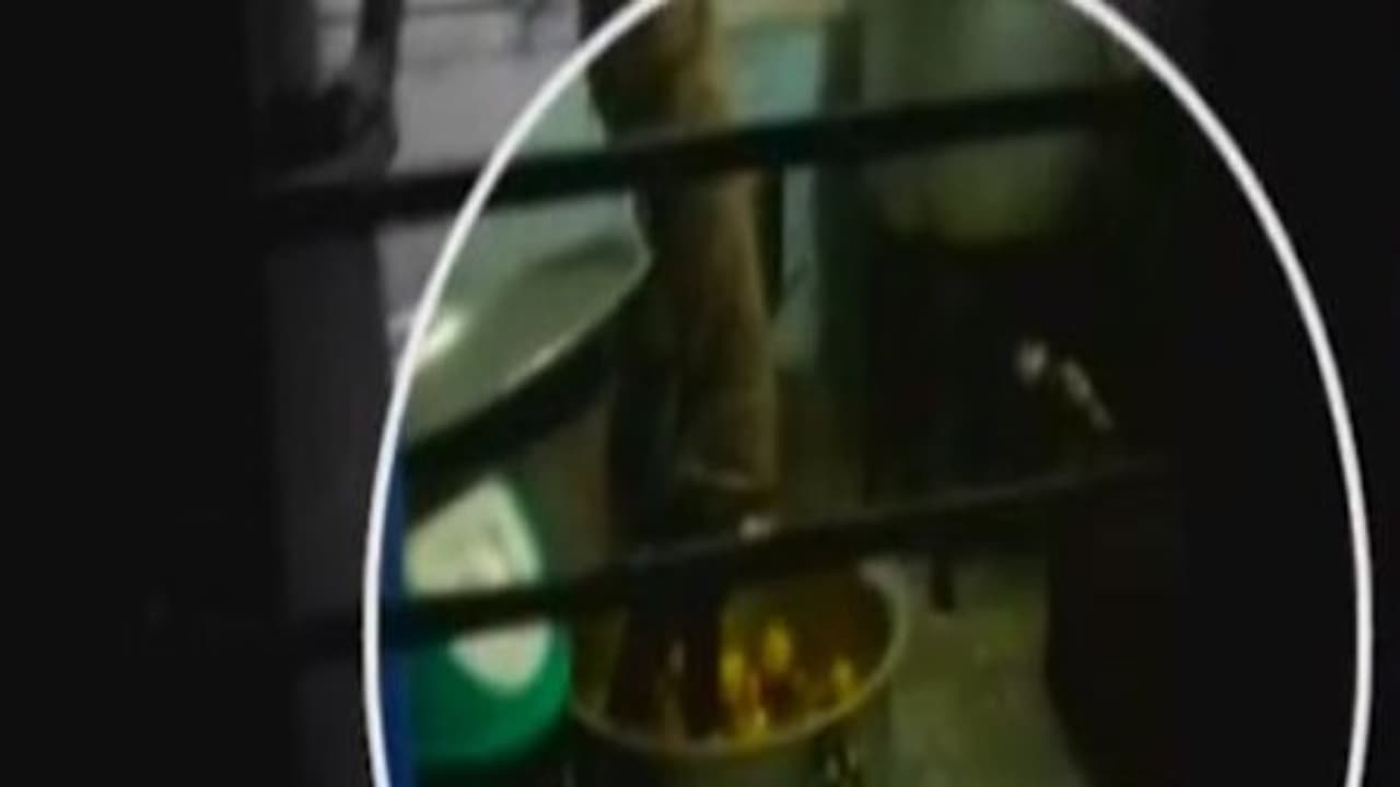 ரயில்வே ஊழியர் ஒருவர்,உணவு தயாரிக்கும் பெட்டியில் உருளை கிழங்கை தன் காலில் மிதித்து, அதனை பொடியாக்குகிறார்.