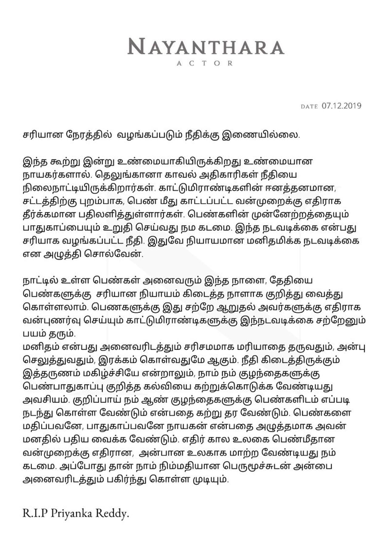 லேடி சூப்பர் ஸ்டார் நயன்தாரா என்றாலே ரசிகர்களுக்கு ரொம்ப ரொம்ப விருப்பமான நடிகை. மிக சிறந்த நடிகையான நடிகை நயன்தாரா அவ்வளவு சீக்கிரம் எந்த ஒரு கருத்தையும் முன் வைக்க மாட்டார். ஆனால் முதன் முறையாக பெண் மருத்துவர் கொலை வழக்கு தொடர்பாக குற்றவாளிகளை என்கவுண்டர் செய்யப்பட்டதற்கு வரவேற்பு தெரிவித்து உள்ளார்.