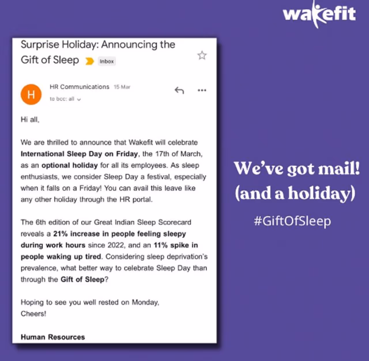 'தூக்க பரிசு' என தலைப்பிடப்பட்ட அந்த அறிவிப்பில், "நமது கிரேட் இந்தியன் ஸ்லீப் ஸ்கோர்கார்டின் 6ஆவது பதிப்பு விவரங்கள் சொல்வது என்னவெனில், 2022ஆம் ஆண்டு நிலவரப்படி, வேலை நேரத்தில் மக்களுக்கு தூக்கம் வருவது 21% ஆக உள்ளது. தினமும் சோர்வாக எழுந்திருப்பதில் 11% ஆக உணருவதை அந்த தகவல்கள் வெளிப்படுத்துகிறது. தூக்கமின்மையின் தாக்கத்தை கருத்தில் கொண்டு, தூக்க நாளைக் கொண்டாடுவதை விட சிறந்த வழி வேறு என்ன? தூக்கத்தின் பரிசு" என்று அந்த நிறுவனம் தனது ஊழியர்களுக்கு மெயில் (mail) எழுதியது.