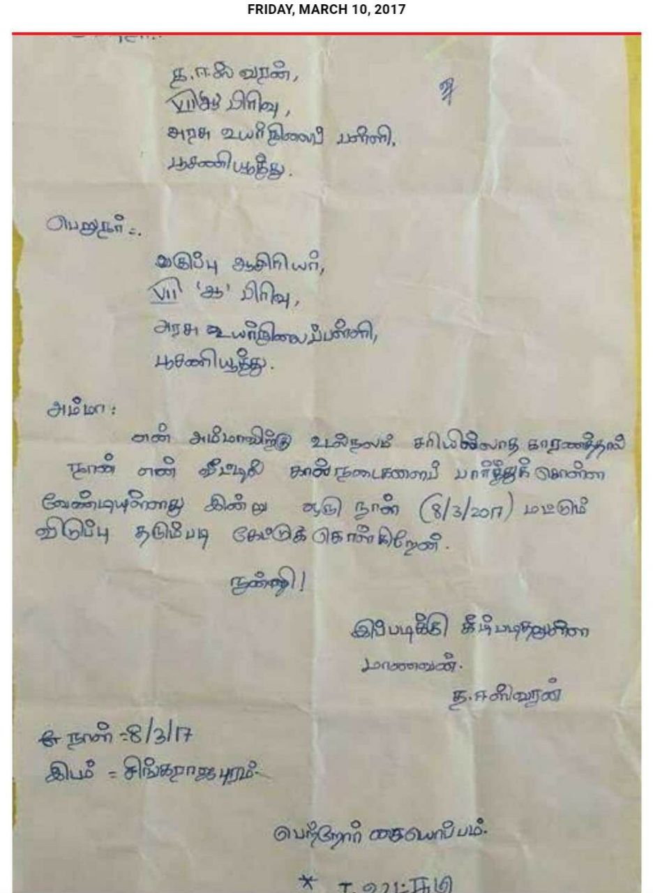 ஈஸ்வரனின் லீவ் லெட்டர் தற்போது வைரலாக பரவி வருகிறது. உண்மையை சொல்லி விடுப்பு கேட்ட ஈஸ்வரனை பாராட்டி , மாணவர்கள் மத்தியிலும் ஆசிரியர்கள் மத்தியிலும் பேசப்பட்டு வருகிறது