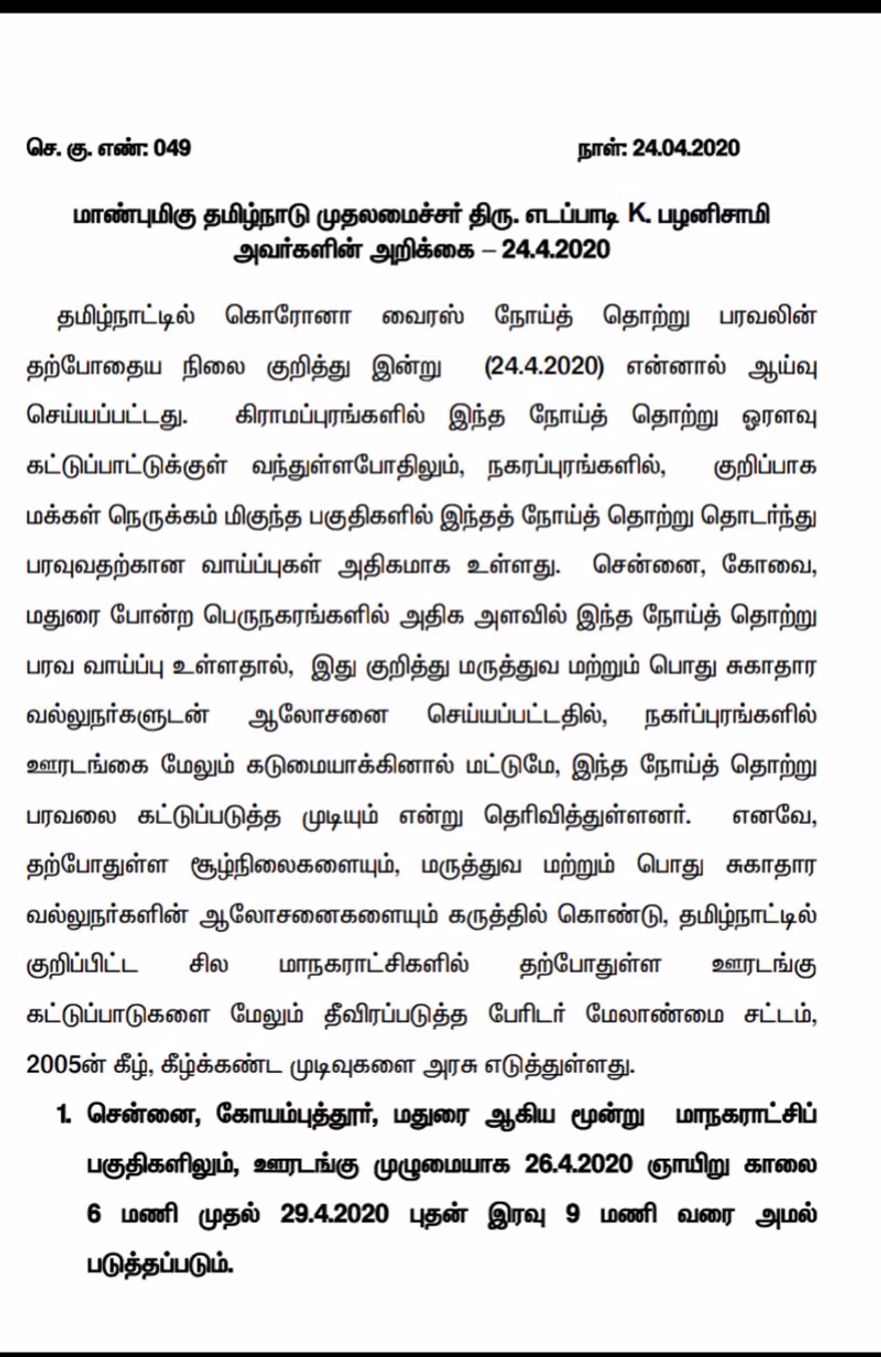 கொரோனா பரவல் வேகமாக வேகமாக பரவும் பகுதிகளான(ரெட் ஸ்பாட்) பகுதிகளில் இந்த 5 மாநகராட்சியில் முழு ஊரடங்கு உத்தரவு பிறப்பித்து முதல்வர் எடப்பாடி பழனிசாமி அறிவிப்பு வெளியிட்டு உள்ளார்