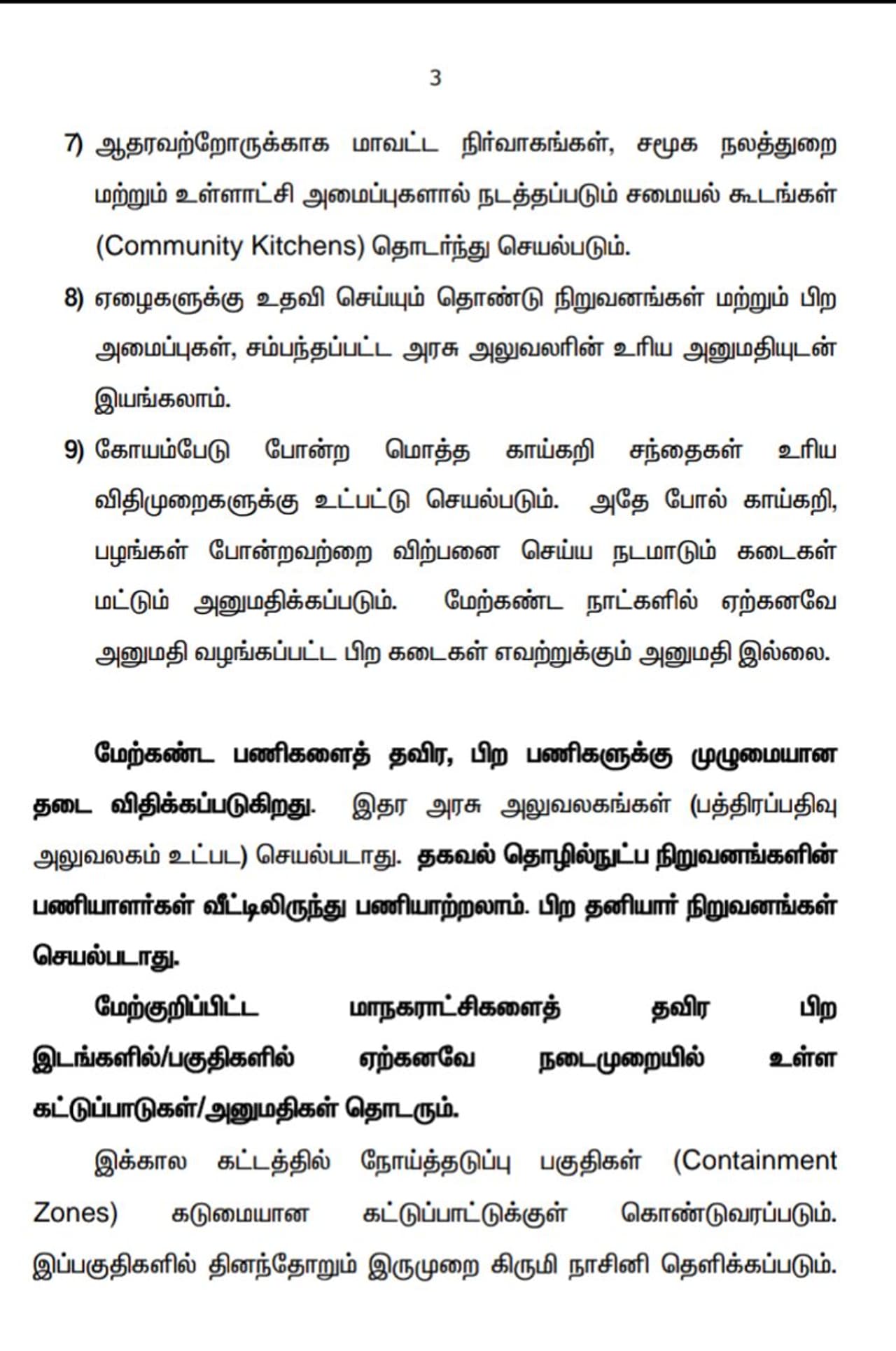 தகவல் தொழில்நுட்ப நிறுவனங்களின் பணியாளர்கள் மட்டும் வீட்டிலிருந்தே பணியாற்றலாம் என்றும், பிற தனியார் நிறுவனங்கள் செயல்படாது என்றும் தெரிவித்து உள்ளது. முதியோர் மாற்றுத் திறனாளி ஆதரவற்றோர் இல்லங்கள் மற்றும் முதியோருக்கு உதவி புரிவோர் ஆகியோருக்கு அனுமதி வழங்கப்படும் என்றும் தெரிவித்து உள்ளது. உணவகங்களில் தொலைபேசி மூலம் ஆர்டர் செய்து வீடுகளுக்கு வழங்கப்படும் உணவுக்கு மட்டும் அனுமதி வழங்கப்படும் எனவும் குறிப்பிடப்பட்டு உள்ளது