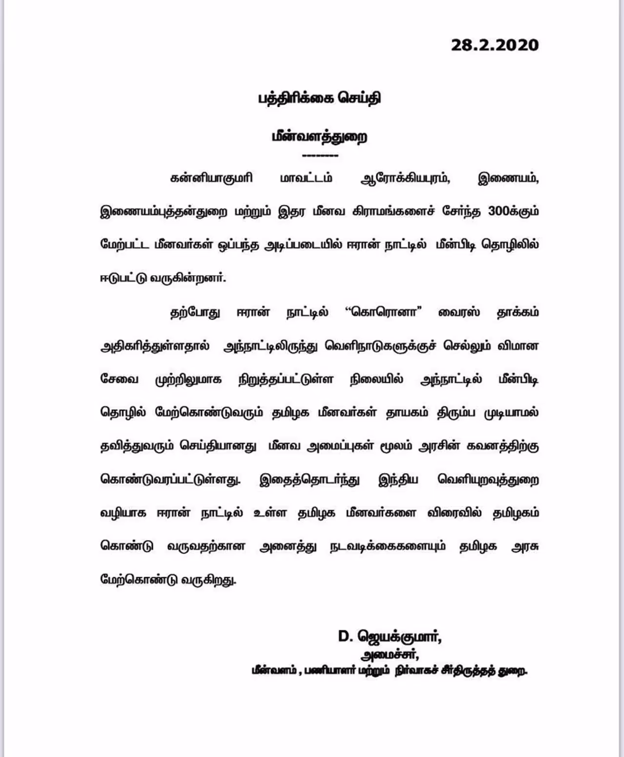 300-க்கும் மேற்பட்ட தமிழக மீனவர்கள் ஒப்பந்த அடிப்படையில் ஈரான் நாட்டில் மீன்பிடி தொழிலில் ஈடுபட்டு வருகின்றனர். இந்தநிலையில் சீனாவில் தோன்றிய கொரோனா வைரஸ் எதிரொலியாக உலகின் பல்வேறு நாடுகளில் படுவேகமாக கொரோனா தாக்கம் அதிகரித்து வருகிறது.