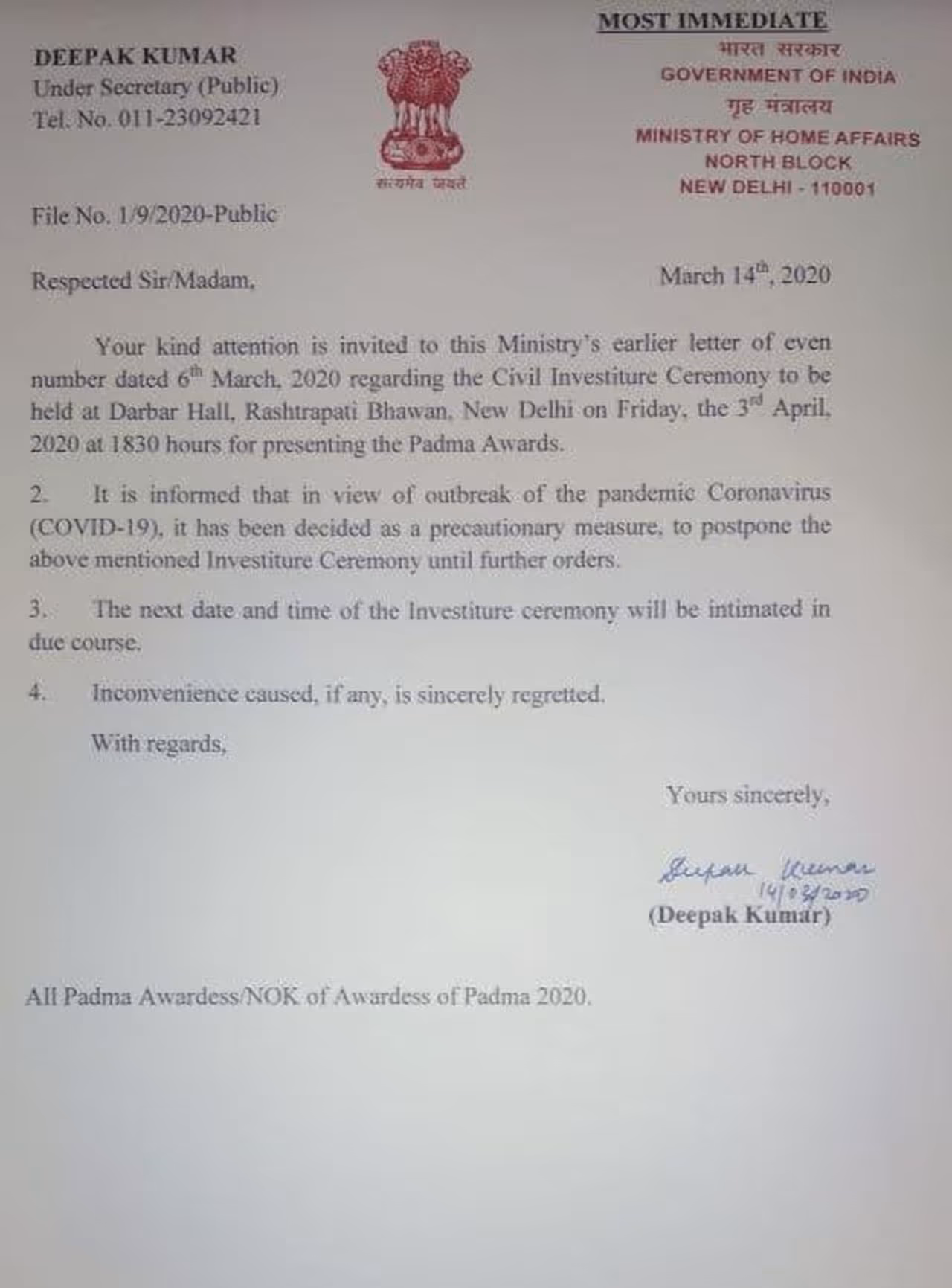 இந்தநிலையில், மத்திய அரசு வெளியிட்டுள்ள அறிவிப்பில், வருகிற ஏப்ரல் 3ந்தேதி நடைபெற திட்டமிட்டிருந்த பத்ம விருதுகள் வழங்கும் விழா கொரோனா வைரஸ் பாதிப்பு எதிரொலியாக ஒத்தி வைக்கப்பட்டுள்ளதாகவும்,இந்த விழா நடைபெறும் நாள் மற்றும் நேரம் பற்றி பின்னர் அறிவிப்பு வெளியாகும் எனவும் அந்த சுற்றறிக்கையில் தெரிவிக்கப்பட்டு உள்ளது.