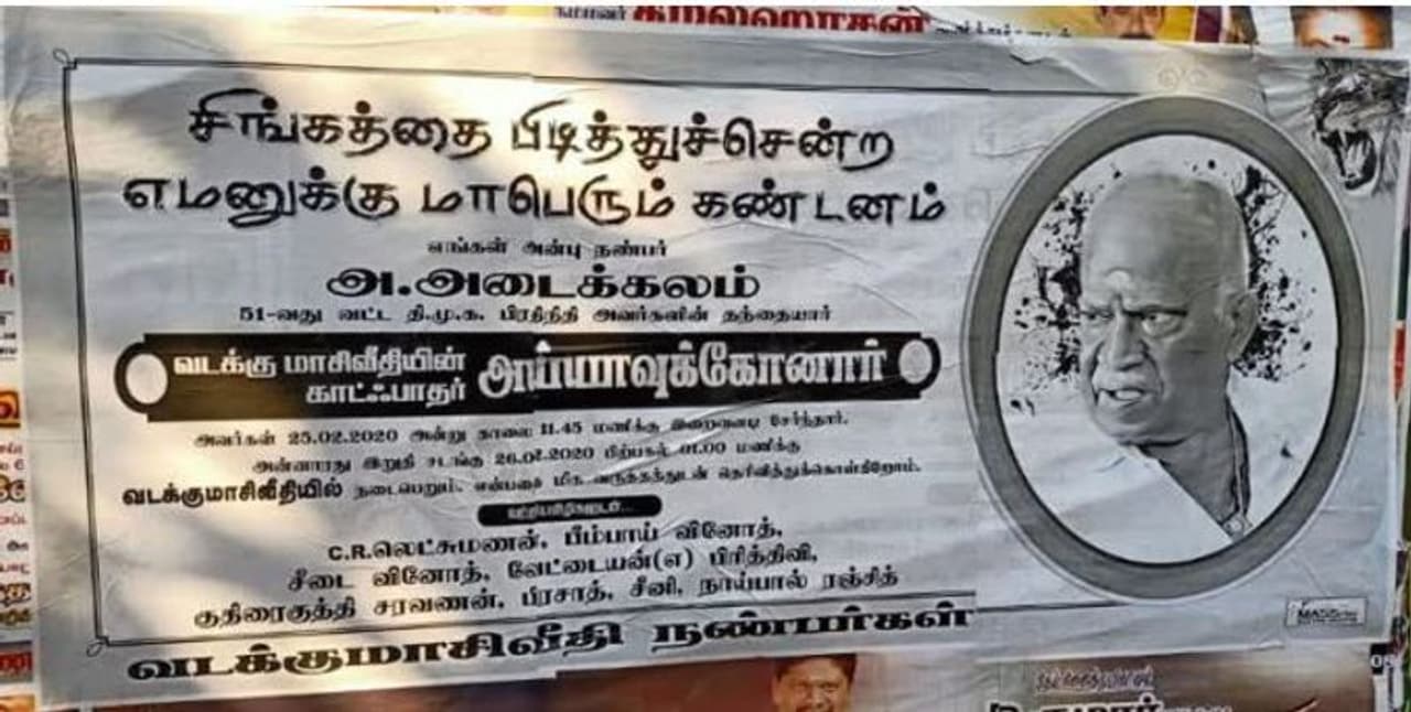 அந்த வகையில் தற்போது மதுரை வடக்குமாசி பகுதியை சேர்ந்தவர் அடைக்கலம் என்பவர். இவர் 51 ஆவது வட்ட திமுக பிரதிநிதியாக இருக்கிறார். இவருடைய அப்பா பெயர் அய்யாவு. கடந்த 25ஆம் தேதி அதிகாலை காலமானார். இவருடைய இறப்பை தாங்க முடியாத குடும்பத்தினர் போஸ்டர் ஒட்டுவது ஒரு வித்தியாசமான பதிவை இட்டு உள்ளனர். அதில் சிங்கத்தை பிடித்து சென்ற எமனுக்கு மாபெரும் கண்டனம் என போஸ்டர் ஒட்டப்பட்டு உள்ளது என்பது குறிப்பிடத்தக்கது. மேலும் அதன் கீழ் வித்தியாசமாக சில அடைமொழி சேர்த்து பெயர் போடப்பட்டு உள்ளது.
