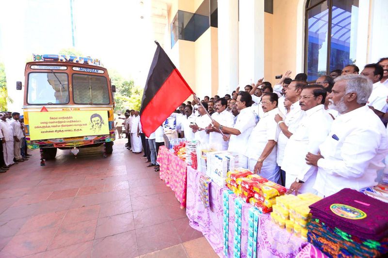 கேரள மாநில மக்களுக்கு உதவிடும் வகையில், அரிசி, சேலை, லூங்கி, சட்டை உள்ளிட்ட துணிமணிகள், போர்வை, தண்ணீர் பாட்டில், ஸ்டீல் தட்டு, டம்ளர், பிளாஸ்டிக் பக்கெட், மெழுகுவர்த்தி, கொசுவர்த்திகள், ரொட்டி, ரெஸ்க், பிஸ்கட் உள்ளடக்கிய உணவுப் பொருட்கள் நோட்டுப் புத்தகம், பேனா, பென்சில், டூத்பேஸ்ட், டூத்பிரஷ், நாப்கின், மருந்துப் பொருட்கள் மற்றும் அத்தியாவசியப் பொருட்கள் உள்ளடக்கிய பல்வேறு நிவாரண பொருட்கள் அடங்கிய 10க்கும் மேற்பட்ட லாரியினை, கழகத் தலைவர் மு.க.ஸ்டாலின் கொடியசைத்து அனுப்பி வைத்தார்.