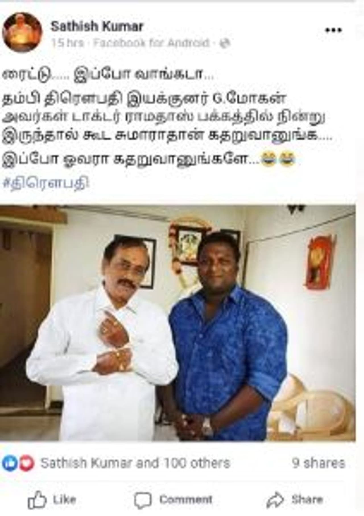 இந்நிலையில் பாஜக தேசிய செயலாளர் ஹெச். ராஜாவை திரௌபதி திரைப்பட இயக்குனர் மோகன் நேரில் சந்தித்து புகைப்படம் எடுத்துள்ளார். இந்த புகைப்படத்தை பலரும் சமூக வலைத் தளத்தில் பதிவிட்டு உள்ளதால் பல்வேறு விமர்சனங்கள் எழுந்து உள்ளது. மேலும், ஒரு சிலர் ராமதாஸ் உடன் போட்டோ எடுத்து இருந்தால் கூட ஒன்னும் சொல்ல மாட்டாங்க.. ஆனால் ஹெச். ராஜா உடன் போட்டோ எடுத்து உள்ளார்..போராளீஸ் கதற போறாங்க என பதிவிட்டு உள்ளனர்