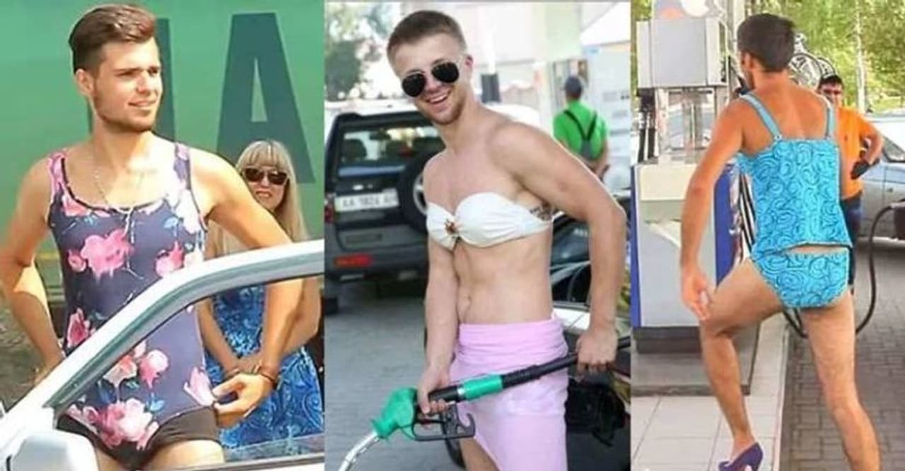 "பிகினி" உடையில் ஆண்கள்...! பெட்ரோல் நிலையத்தில் பரபரப்பு..!
