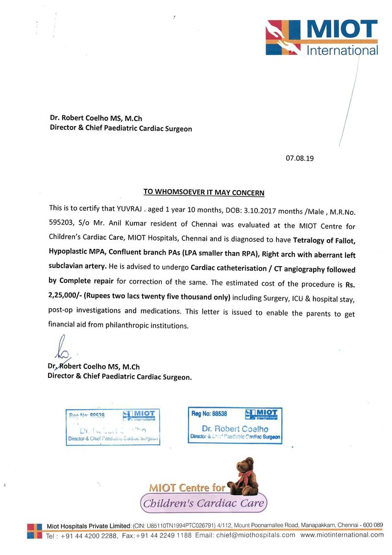 அறுவை சிகிச்சை, ICU மற்றும் மருத்துவமனையில் தங்கி சிகிச்சை பெறுதல் என அனைத்தையும் சேர்த்து தோராயமாக 2 லட்சத்து 25 ஆயிரம் ரூபாய் ஆகும் என்று தெரிவிக்கப்பட்டுள்ளது. இவ்வளவு பணம் செலவு செய்ய முடியாமல் தவித்து வரும் அனில்குமார், குழந்தை யுவராஜை காப்பாற்ற நிதி அளித்து உதவுமாறு பொதுமக்களிடம் கேட்டு கொண்டுள்ளார்.