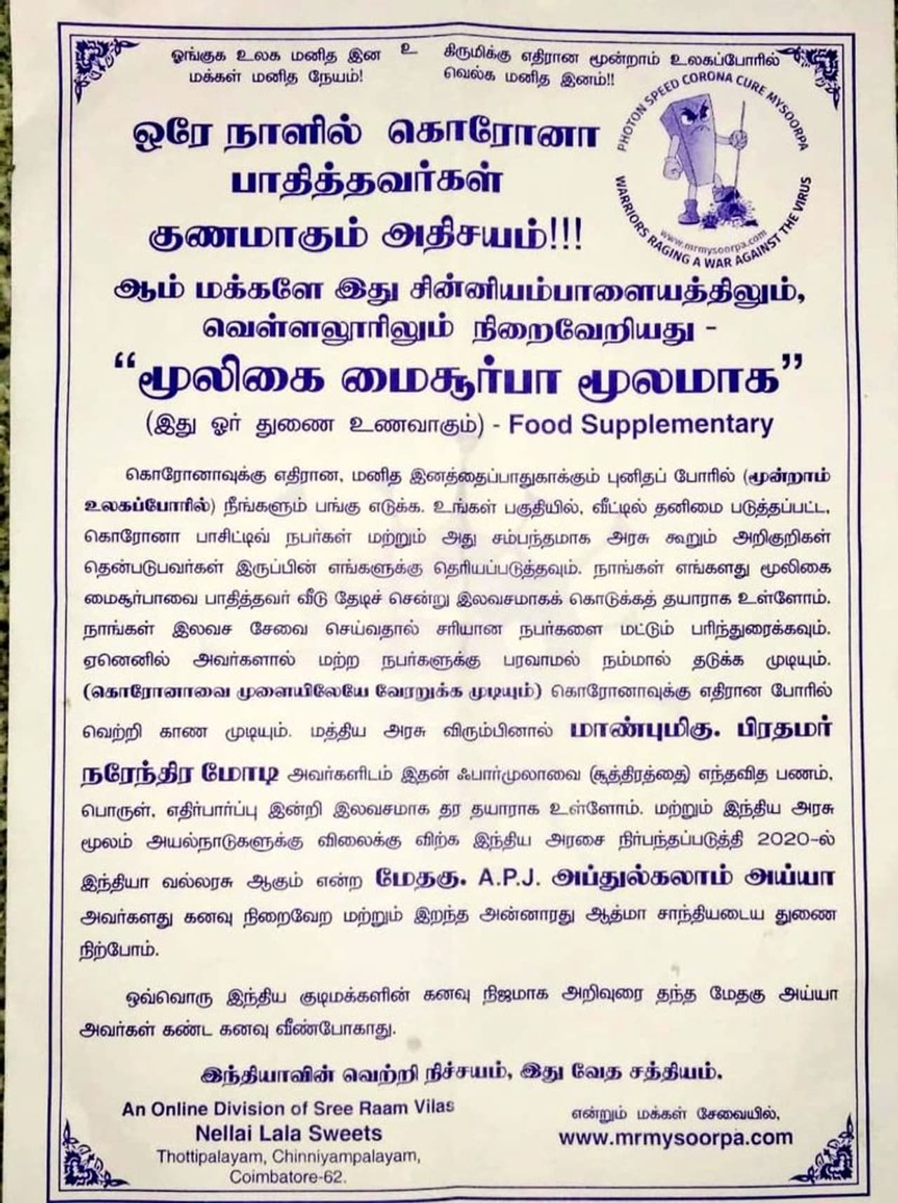 கோயமுத்தூர் தொட்டிபாளையம் பகுதியில் செயல்பட்டு வரும் நெல்லை லாலா ஸ்வீட் கடை, கொரோனா வைரஸ் பாதித்தவர்கள் மூலிகை மைசூர்பா உண்பதன் மூலம் குணமடைய முடியும் என்ற நோட்டீஸ் ஒன்றை அச்சடித்து அப்பகுதி மக்களுக்கு வழங்கி வருகிறது. அந்த நோட்டீசில் ஒரே நாளில் கொரோனா பாதித்தவர்கள் குணமாகும் அதிசயம், இது சின்னியம்பாளையம் மற்றும் வெள்ளலூரில் நிறைவேறி உள்ளது. கொரோனா அறிகுறிகள் இருப்பவர்கள் வீட்டிற்கு தேடிச்சென்று இலவசமாக வழங்கவும் தயாராக உள்ளோம், மத்திய அரசு விரும்பினால் பிரதமர் நரேந்திர மோடி அவர்களிடம் இந்த பார்முலாவை எவ்வித பணம் பொருள் எதிர்பார்ப்பும் இன்றி இலவசமாக தர தயாராக உள்ளோம், 2020இல் இந்தியா வல்லரசாகும் என்ற மேதகு ஏபிஜே அப்துல் கலாம் ஐயா அவர்களது கனவு நிறைவேற மற்றும் இறந்த அவரது ஆத்மா சாந்தி அடைய துணை நிற்போம் என்ற வாசகங்கள் அடங்கி உள்ளது.தற்பொழுது அந்த நோட்டீஸானது சமூக வலைதளங்களில் வேகமாக பகிரப்பட்டு வருகிறது.