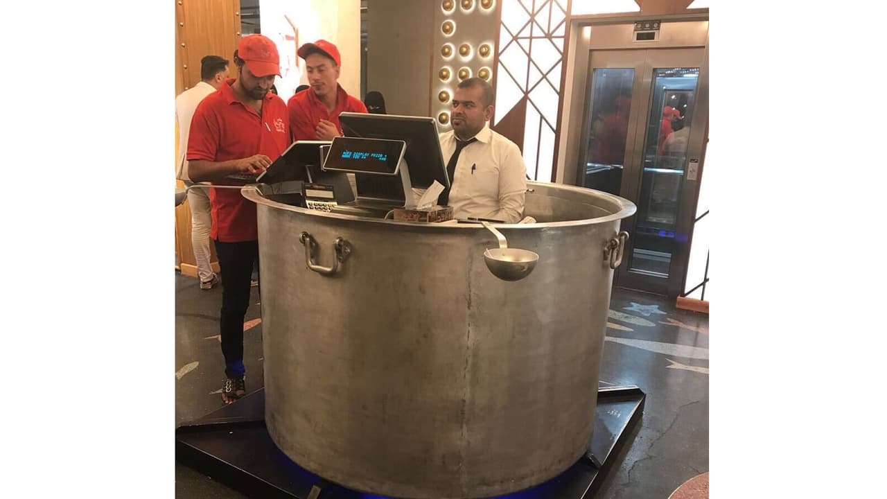 கிட்டத்தட்ட பிரியாணி செய்யும் அண்டா மாதிரியான ஒரு பாத்திரத்தினுள் பில் போடும் உபகரணங்கள் மற்றும் கேஷியரின் இருக்கை என எல்லாம் அமைந்திருகிறது. அந்த அண்டாவையும் அடுப்பின் மேல் வைத்திருக்கின்றனர்.