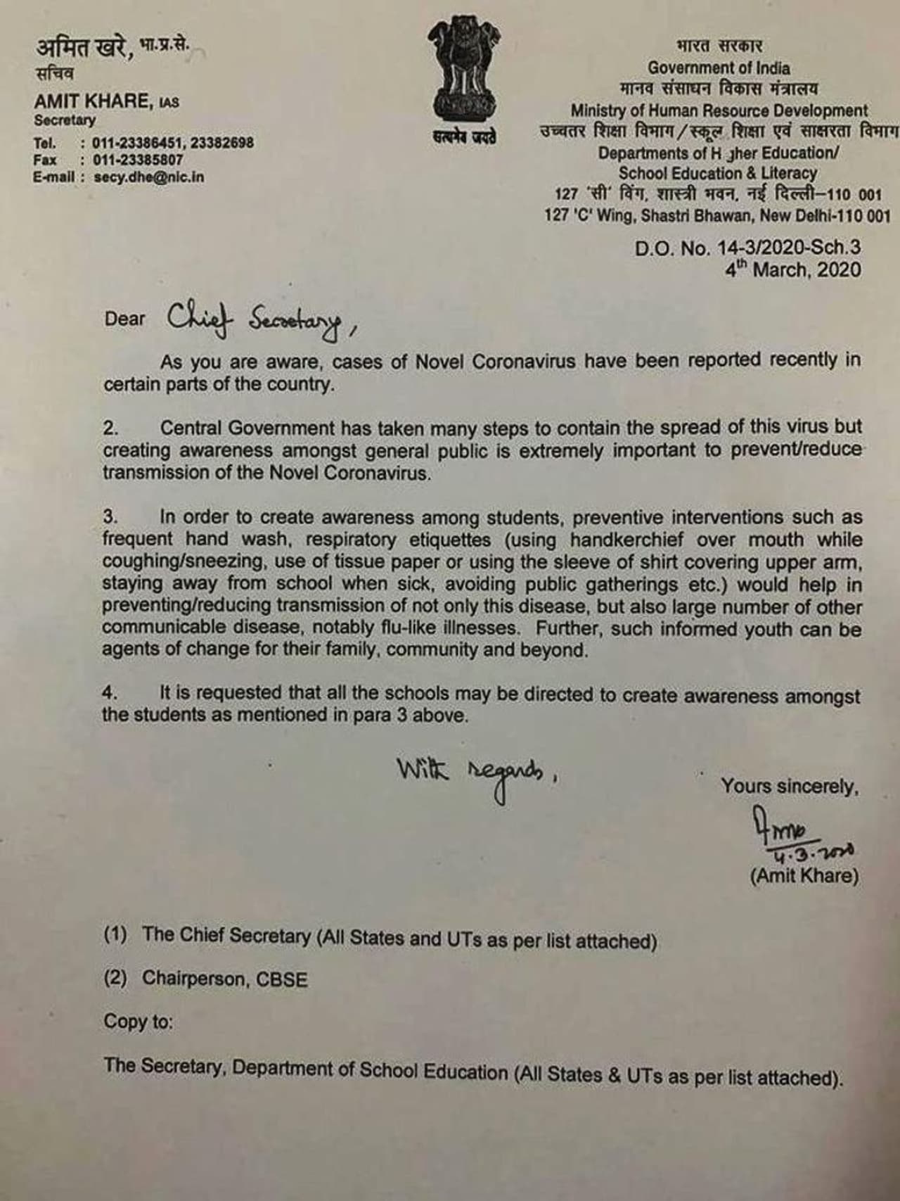 இவை அனைத்தையும் மீறி கட்டாயம் அடிக்கடி கை கழுவி தூய்மையாக வைத்திருக்க வேண்டும் என அறிவுறுத்தப்படுகிறது. எனவே இந்த விழிப்புணர்வை அனைத்து பள்ளிகளும் பின்பற்ற வேண்டும் என்றும், மாணவர்கள் மத்தியில் மேற்குறிப்பிட்ட விஷயத்தை குறித்து புதிய வைத்து நல்ல முறையில் விழிப்புணர்வை ஏற்படுத்த வேண்டும் என்றார் உயர்கல்வித்துறை செயலாளர் அமித் காரே தெரிவித்துள்ளார். இதுகுறித்த அறிவிப்பை மனிதவளத்துறை மேம்பாட்டு அமைச்சகம் தெரிவித்துள்ளது.