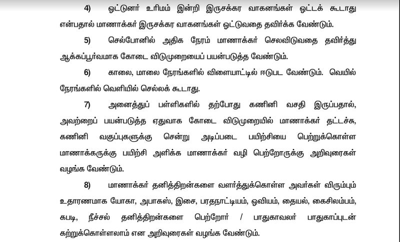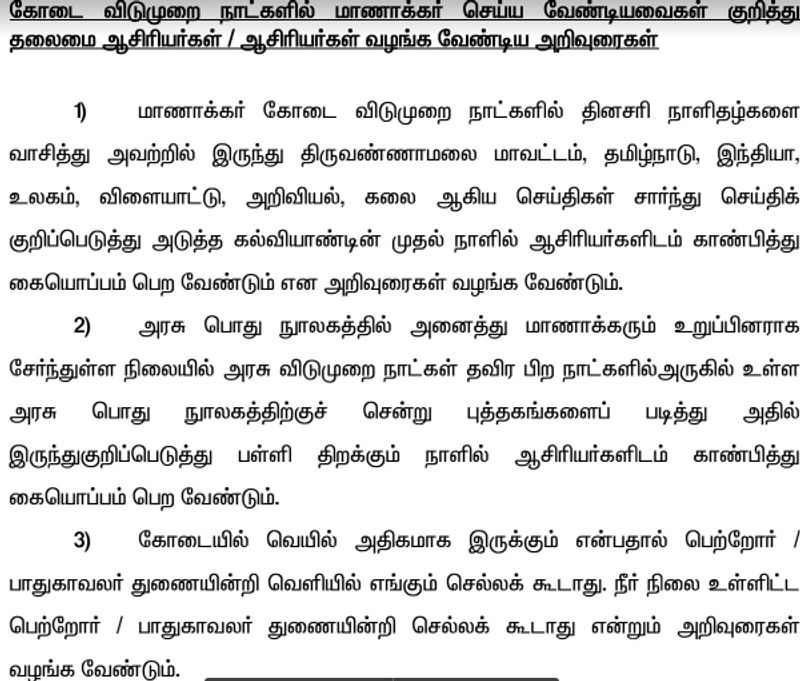 கோடை விடுமுறையில் மாணவர்கள் விடுமுறையை எவ்வாறு பயன்படுத்திக் கொள்ள வேண்டும் என திருவண்ணாமலை மாவட்ட முதன்மை கல்வி அலுவலர் 9 முக்கிய குறிப்புகள் அடங்கிய சுற்றறிக்கையை ஆசிரியர்களுக்கு அனுப்பிமாணவர்களுக்கு அறிவுரை வழங்குமாறு கேட்டுக் கொண்டுள்ளார்.