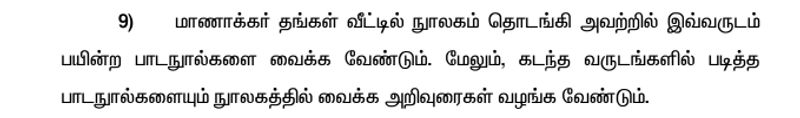 மாணவர்கள் தங்கள் வீட்டில் நூலகம் தொடங்கி அவற்றில் இவருடன் பயணித்த பாடநூல்களை வைக்க வேண்டும் மேலும் கடந்த வருடங்களில் படித்த பாடநூல்களையும் வைக்க அறிவுரைகள் வழங்க வேண்டும்.