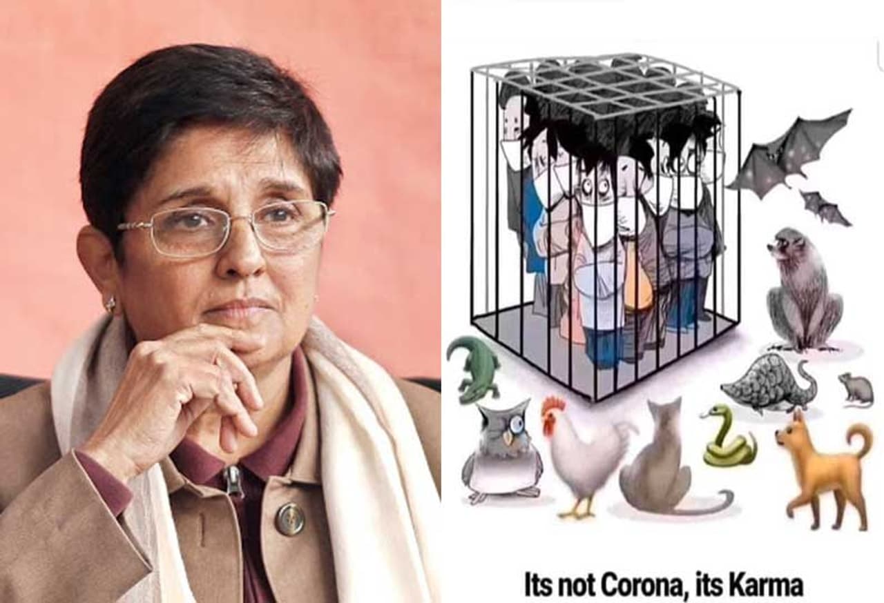 இந்நிலையில், புதுச்சேரி கவர்னர் கிரண்பேடி டுவிட்டரில் வரைபடம் ஒன்றை வெளியிட்டு உள்ளார். அதில், மனிதர்கள் முக கவசம் அணிந்து கொண்டு கைகளை கட்டியபடி கூண்டுக்குள் அடைப்பட்டு நிற்கிறார்கள். அவர்களை சுற்றிலும், விலங்குகள் மற்றும் பறவைகள் உள்ளிட்டவை வெளியே சுதந்திரமாக இருக்கின்றன.அதன் கீழே இது கொரோனா அல்ல கர்மா என பதிவிட்டுள்ளார். நாம் யாரை உட்கொள்கிறோம் என்ற பொறுப்பை ஏற்று கொள்கிறோமா? என்றும், இது தீங்கில்லா உணவை தேர்வு செய்யும் வழக்கம் பற்றிய விசயமும் ஆகும் என்றும், அதில் அவர் தெரிவித்துள்ளார்.