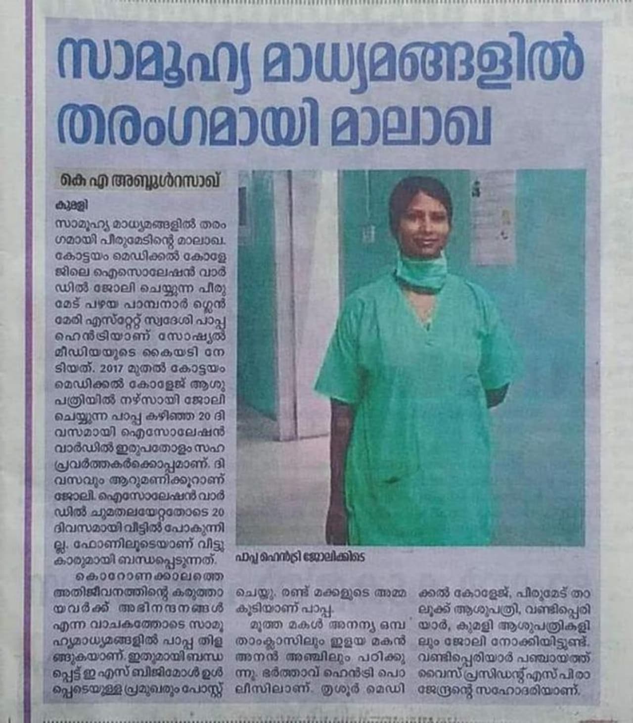 அந்த வகையில் தற்போது, மலையாள சமூக வலைத்தளங்களில் வைரலாகி வரும், #Pappa #Hentry.. இவர், கேரள மாநிலம் கோட்டயம் மருத்துவக் கல்லூரியில், Staff Nurse ஆக பணிபுரிந்து வருகிறார். இடுக்கி மாவட்டம், பீருமேட்டை சேர்ந்தவர் இவர், கோட்டயம் மருத்துவக் கல்லூரியின், Isolation Wardல், போர்க்கால அடிப்படையில் கொரோனா நோயாளிகளுக்கு பணியாற்றி வருகிறார்.