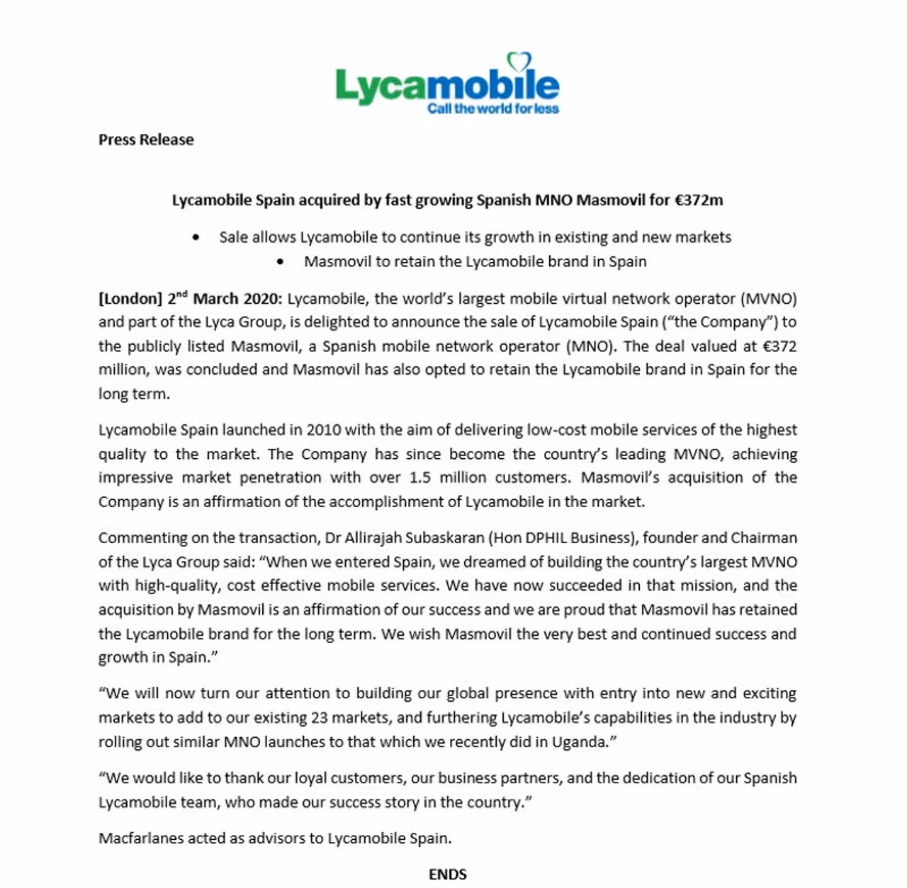 இந்த ஒரு தருணத்தில் லைக்கா மொபைல் நிறுவனத்தின் ஸ்பெயின் நாட்டில் இயங்கிவந்த கிளையை அந்த நாட்டில் உள்ள மிகப்பெரிய நிறுவனம் ஒன்று 372 மில்லியன் யூரோக்களை கொடுத்து வாங்கியுள்ளது என்பது குறிப்பிடத்தக்கது. அதாவது இந்திய ரூபாய் மதிப்பில் சொல்லவேண்டுமென்றால் 3,100 கோடி ரூபாய். வரலாற்றிலேயே ஒரு mvno கம்பெனி இந்த அளவிற்கு விலை போனது இதுவே முதல் முறை. இந்த ஒரு கிளை நிறுவனம் விற்கப்பட்டுள்ள நிலையில் மற்ற 23 நாடுகளில் உள்ள மற்ற கிளை நிறுவனங்களும் மிக சிறப்பாக இயங்கி வருகிறது என்பது குறிப்பிடத்தக்கது