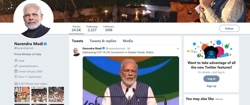 2009 ஆம் ஆண்டு தனக்கென தனி ட்விட்டர் பக்கம் தொடங்கிய பிரதமர் நரேந்திர மோடி அப்போது குஜராத் முதல்வராக இருந்தார். பின்னர் மத்தியில் பாஜக ஆட்சியைப் பிடித்த பின் பிரதமராக பதவியேற்ற மோடிக்கு 2018 ஆம் ஆண்டு ஜூலை மாதம் முடிய 4 கோடிக்கும் அதிகமானவர்கள் பின்தொடர்ந்தனர்.