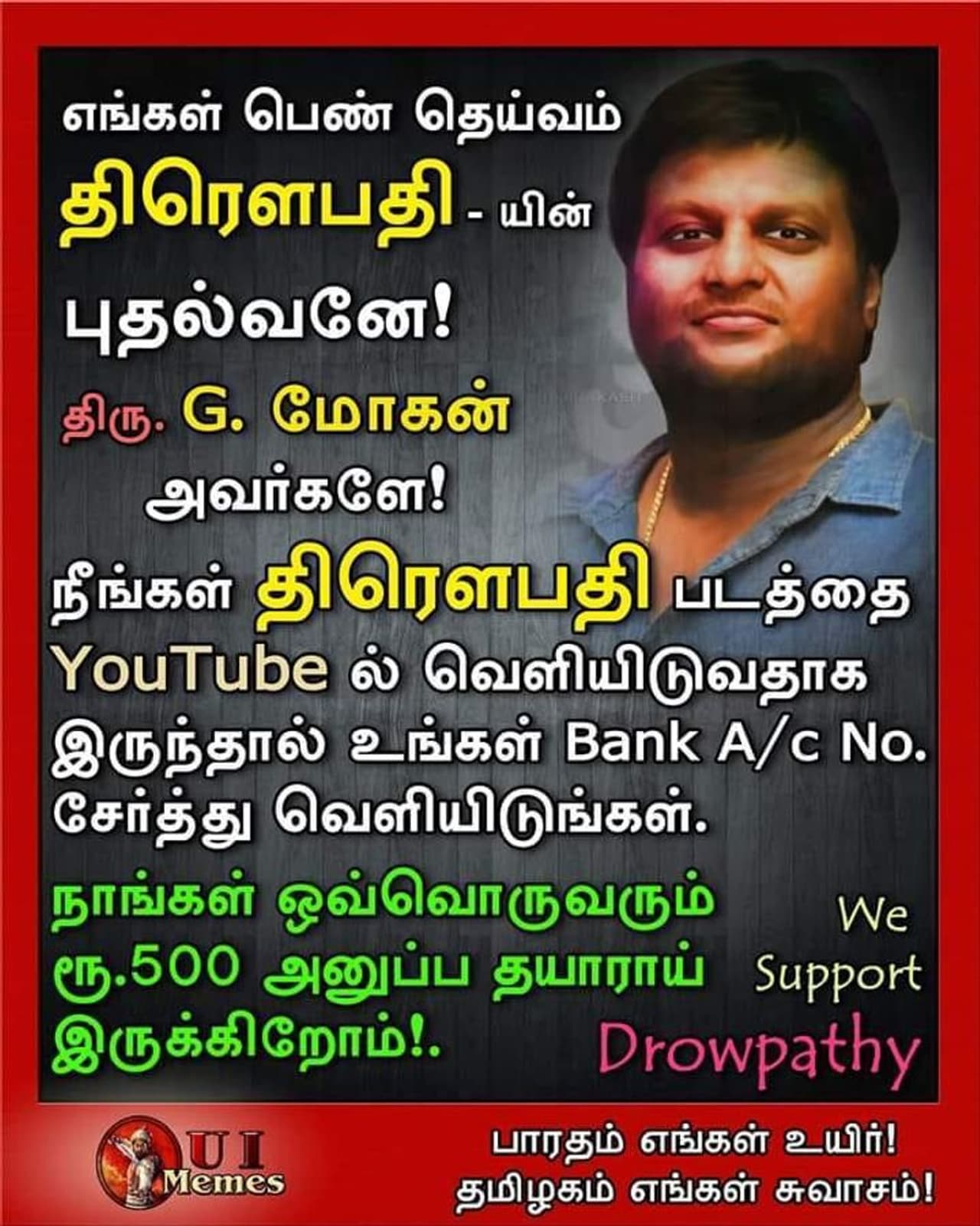 இந்த நிலையில் திரௌபதி படத்தின் இயக்குனர் மோகனுக்கு ஆதரவாக பல்வேறு நபர்கள் சிலர் போஸ்டர் வெளியிட்டு வருகின்றனர். மேலும் மீம்ஸ் உருவாக்கியும் பதிவிட்டு வருகின்றனர் அதில் "எங்கள் பெண் தெய்வம் திரௌபதியின் புதல்வனே... திரு. ஜி.மோகன் அவர்களே..! நீங்கள் திரௌபதி படத்தை யூடியூபில் வெளியிடுவதாக இருந்தால் உங்கள் வங்கி கணக்கு எண்ணையும் சேர்த்து வெளியிடுங்கள். நாங்கள் ஒவ்வொருவரும் ரூபாய் 500 அனுப்ப தயாராக இருக்கிறோம் என தெரிவித்து உள்ளனர்.