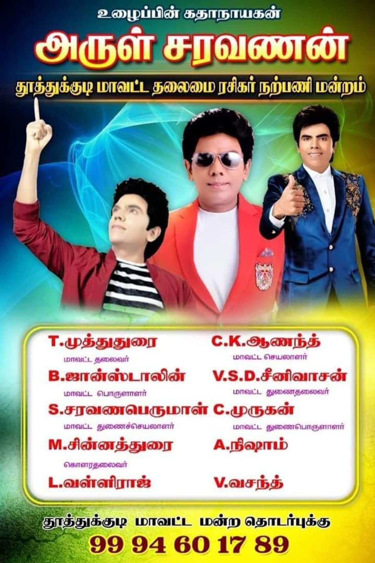 தூத்துக்குடி மாவட்ட தலைமை ரசிகர நற்பணி மன்றத்தின் சார்பாக உழைப்பின் கதாநாயகன் அருள் சரவணன் என தலைப்பிடப்பட்ட போஸ்டர் அடித்து தூத்துக்குடி முழுதும் ஆங்காங்கு ஒட்டப்பட்டு உள்ளது.இந்த போஸ்டர் தற்போது அனைவரின் கவனத்தையும் ஈர்த்துள்ளது.