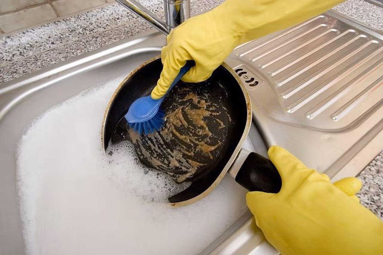 அடுப்பை பற்ற வைத்து, ஒரு கடாயில் 2 டீஸ்பூன் வாஷிங் டிடர்ஜென்ட் மற்றும் 1 டீஸ்பூன் உப்பு சேர்த்து 5 முதல் 10 நிமிடங்கள் கொதிக்க வைக்கவும். சுத்தமான தண்ணீர் மற்றும் பாத்திரம் கழுவும் சோப்புடன் அதை நன்கு கழுவவும்.