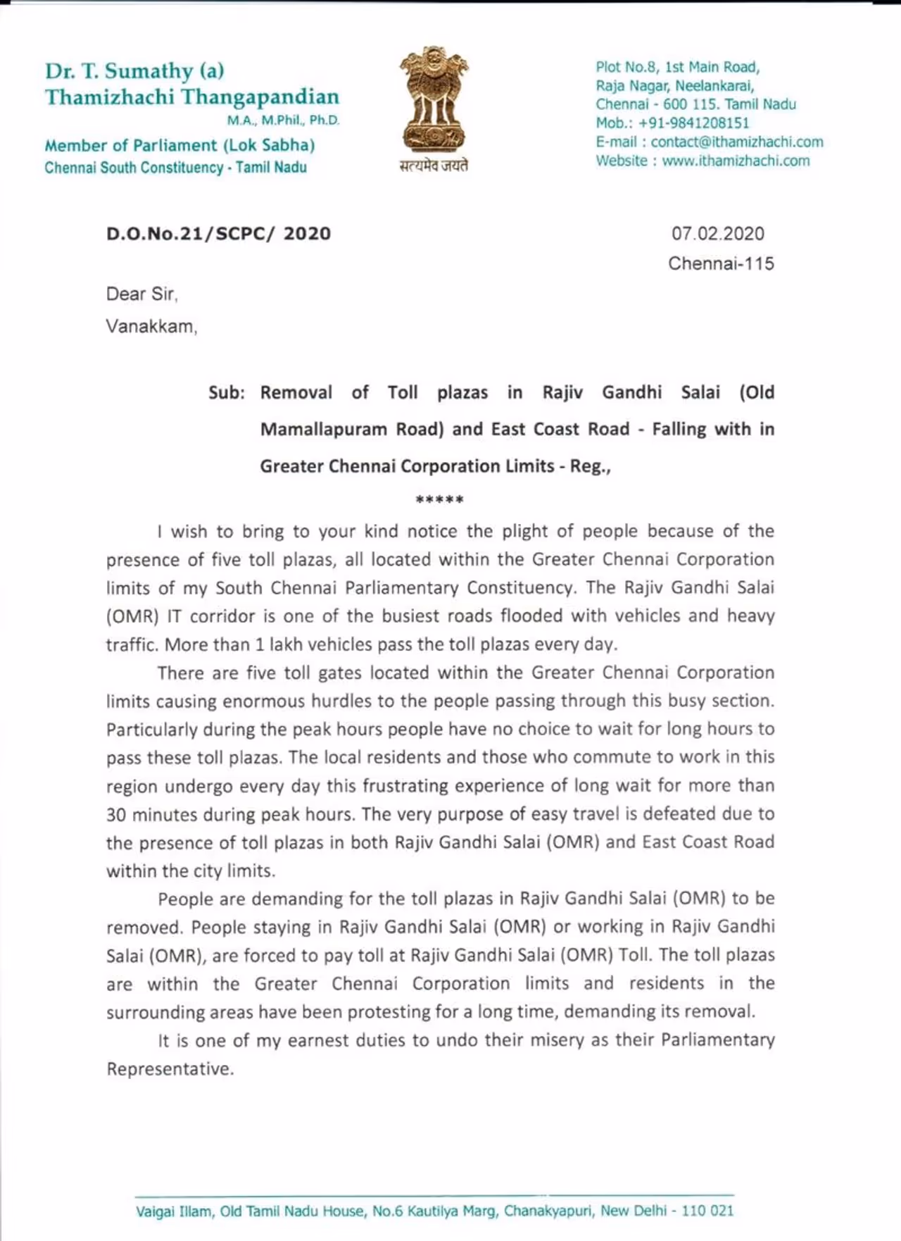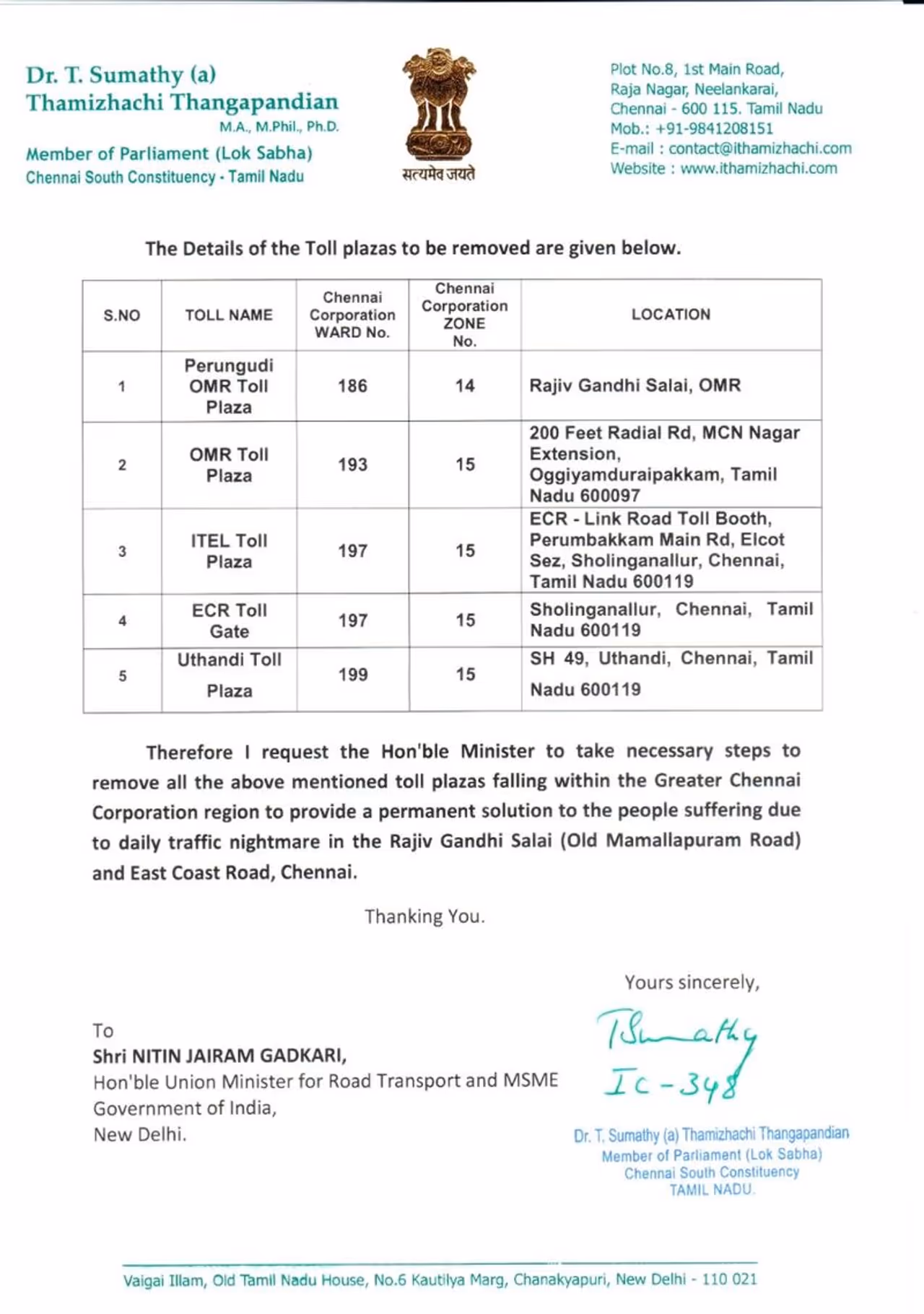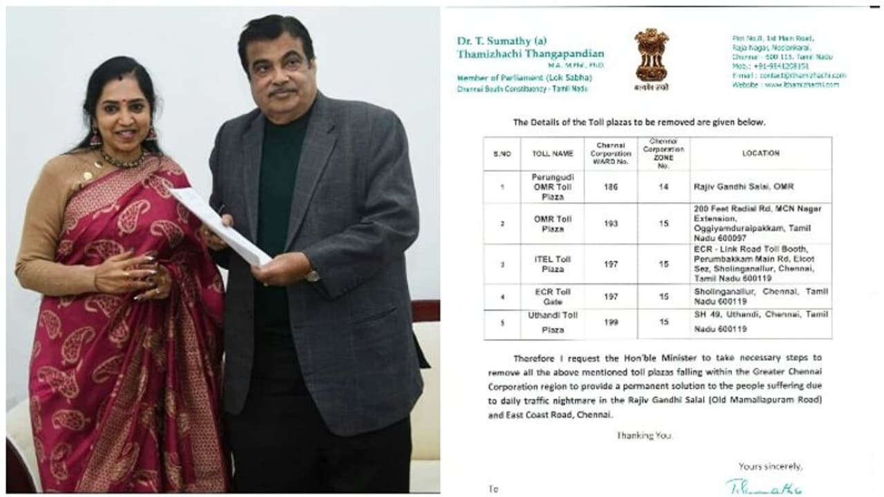 இந்த நிலையில் இந்த சாலையில் உள்ள குறிப்பிட்ட ஐந்து சுங்க சாவடிகளில் வாகனங்கள் கட்டணம் செலுத்த 30 நிமிடங்களுக்கு மேல் காத்திருக்க வேண்டிய நிலை இருக்கின்றது. எனவே இதனை அகற்ற வேண்டும் என அடங்கிய கோரிக்கை மனுவை தென்சென்னை திமுக எம்பி தமிழச்சி தங்கபாண்டியன் நேற்றுமுன்தினம் டெல்லி சென்று மத்திய சாலை போக்குவரத்து அமைச்சர் நிதின் கட்கரியிடம் கொடுத்தார்.