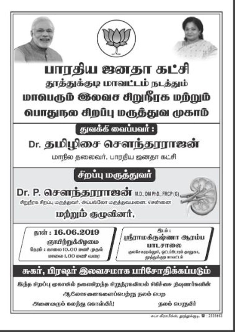 அது மட்டுமல்லாமல் பிரச்சாரத்தின் போது அவர் பயணித்த பல்வேறு கிராமத்தில் அன்பு மழை பொழிந்த மக்களைப் பார்த்து அவர்கள் படும் இன்னல்களை ஒரு மருத்துவராக உணர்ந்து கண்டிப்பாக இலவச மருத்துவ முகாம் நடத்துவேன் என கூறியிருந்தார். குறிப்பாக குலசேகரநல்லூர் என்ற இடத்தில் மருத்துவ முகாம் நடத்தப்படும் என தேர்தலுக்கு முந்தையே தெரிவித்து இருந்தார். பின்னர் தேர்தல் முடிவுகள் வெளியாகி தமிழிசை வெற்றி பெறவில்லை என்றாலும், குலசேகரநல்லூர் மக்களுக்கு தான் கொடுத்த வாக்கை நிறைவேற்ற வேண்டுமென, தற்போது வரும் 16-ஆம் தேதி ஞாயிற்றுக்கிழமை காலை 10 மணிக்கு மாபெரும் இலவச சிறுநீரக மற்றும் பொது நல சிறப்பு மருத்துவ முகாம் நடத்த ஏற்பாடு செய்து வருகிறார்.