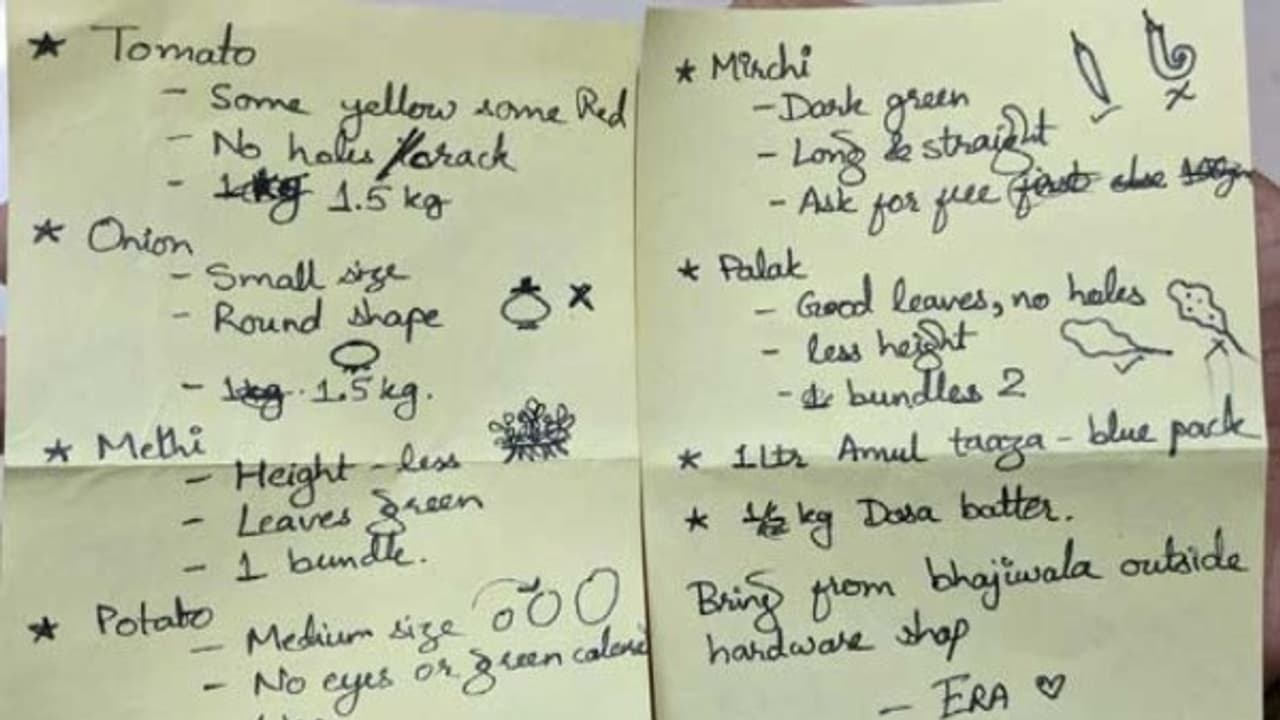 புனேவில் ஒரு பெண் தனது கணவர் காய்கறி வாங்குவதற்காக எழுதி கொடுத்துள்ள லிஸ்ட் தற்போது சமூக வலைதளங்களில் வைரலாக பரவி வருகிறது.