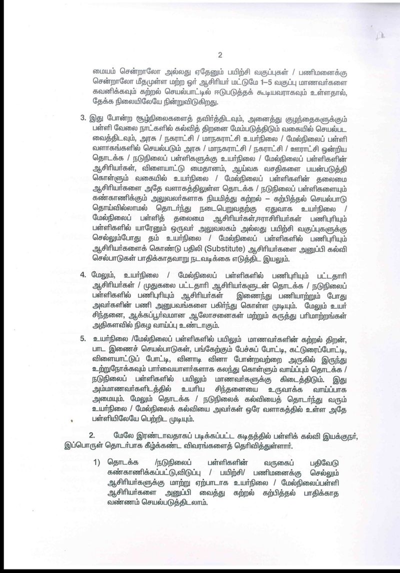 பள்ளிக்கல்வி ஒரே வளாகத்தில் செயல்படும் அரசு மாநகராட்சி நகராட்சி ஊராட்சி ஒன்றிய தொடக்க நடுநிலைப் பள்ளிகளில் மாணவர்களின் நலன் மற்றும் நிர்வாக மேம்பாடு கருதி, நடுனிலை பள்ளிகளின் கல்வி செயல்பாடுகளை ஆய்வு செய்யும் அதிகாரத்தை அதே வளாகத்தில் செயல்படும் அரசு உயர்நிலை மேல்நிலைப் பள்ளிகளின் தலைமை ஆசிரியர்களுக்கு வழங்குதல் தொடர்பாக ஆணை வெளியிடப்பட்டு உள்ளது.