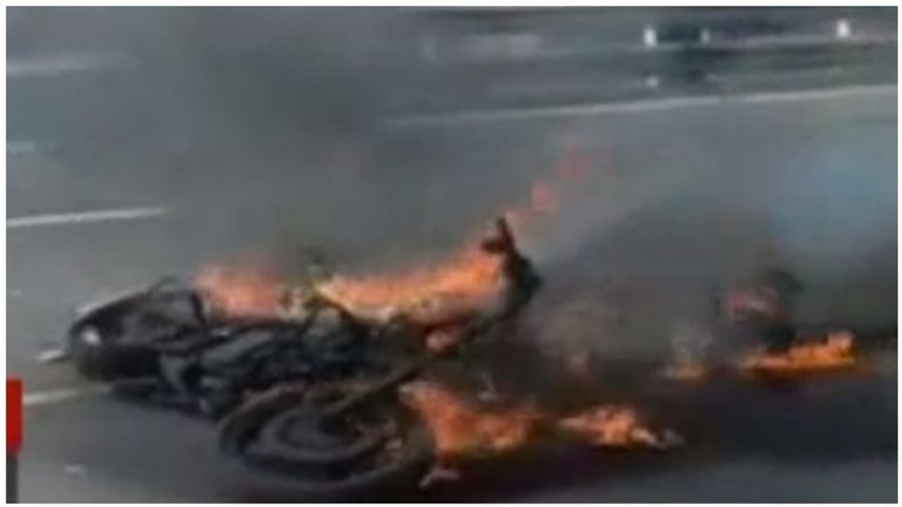 இரு சக்கர வாகனத்தில், இரண்டு பேர் பயணம் செய்து உள்ளனர். அப்போது வாகனத்தில் தீப்பிடித்து உள்ளது. இதனை கண்ட பின்னால் அமர்ந்து இருந்த நபர் எகிறி கீழே குதிக்க, வாகனத்தை ஓட்டி சென்ற நபர் மட்டும் தீயில் கருகி உயிர் இழந்தார். வாகனமும் கருகியது. இந்த சம்பவத்தை நேரில் பார்த்த பின்னால் அமர்ந்து இருந்த நபர் அதிர்ச்சியில் அங்கேயே மயக்கம் அடைந்துள்ளார். இது குறித்து, தகவல் அறிந்து சம்பவ இடத்திற்கு விரைந்து வந்த தீயணைப்பு துறையினர் தீயை அணைத்தனர்.