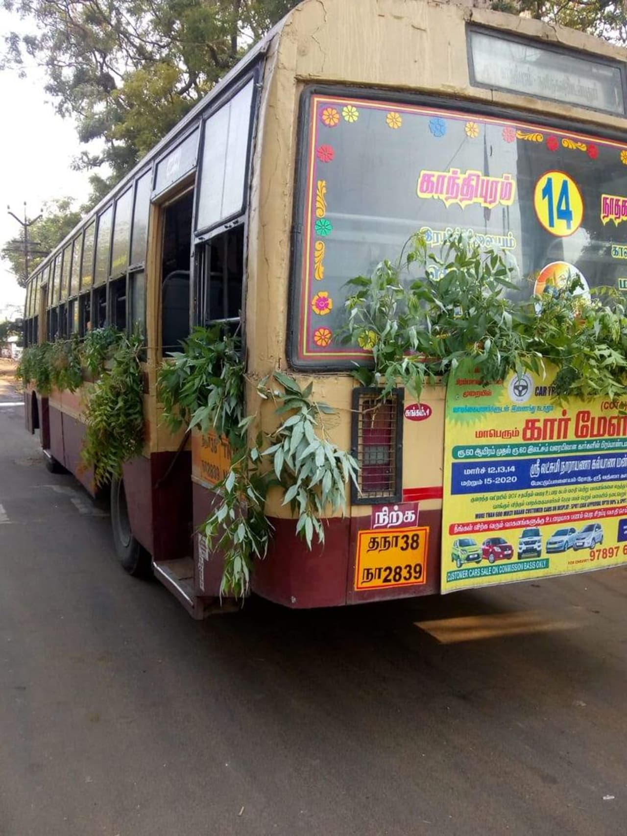 கொரோனா நோய்த் தொற்று பாதுகாப்பு நடவடிக்கையாக, கோவை காந்திபுரத்தில் இருந்து பேரூர், மாதம்பட்டி, ஆலாந்துறை வழித்தடத்தில் நாதேகவுண்டன்புதூர் வரை செல்லும் அரசுப் பேருந்துக்கு கிராம மக்கள், பேருந்துகளின் வெளிப்புறம், உள்புறங்களில் வேப்பிலை, துளசியை கொத்துக் கொத்தாகச் செருகி வைத்தும், பேருந்தின் படிக்கட்டுகள் மற்றும் நடைமேடையில் மாட்டுச்சாணம், மஞ்சள் கரைசலைக் கலந்தும் தெளித்துள்ளனர்.