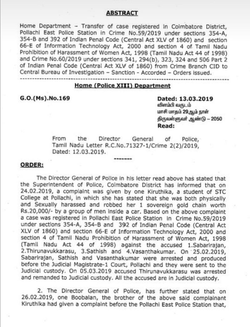 இதெல்லாம் ஒரு பக்கம் இருக்க, பொள்ளாச்சி விவகாரம் சிபிஐ விசாரணைக்கு மாற்ற தமிழக அரசு பரிந்துரை செய்துள்ளது. அது சரி. ஆனால், பாதிக்கப்பட்ட பெண்களின் பாதுகாப்பு உறுதி செய்யப்படும் எனவே தாமாக முன்வந்து புகார் கொடுத்தால், உரிய நடவடிக்கை எடுக்கப்படும் என காவல் துறை தெரிவித்து இருந்தது. ஆனால், பொள்ளாச்சி பாலியல் வன்கொடுமை வழக்கினை சிபிஐக்கு மாற்றுவதற்கான அரசாணையில் பாதிக்கப்பட்ட பெண்ணின் பெயர், என்ன படிப்பு, எந்த கல்லூரி, அவருடைய அண்ணன் பெயர் என விலாசத்தோடு வெளியிட்டு உள்ளது அரசு.. இதற்கு பெயர் தான் பாதிக்கப்பட்ட பெண்ணின் பாதுகாப்பு உறுதிப்படுத்தப்படுமா..?