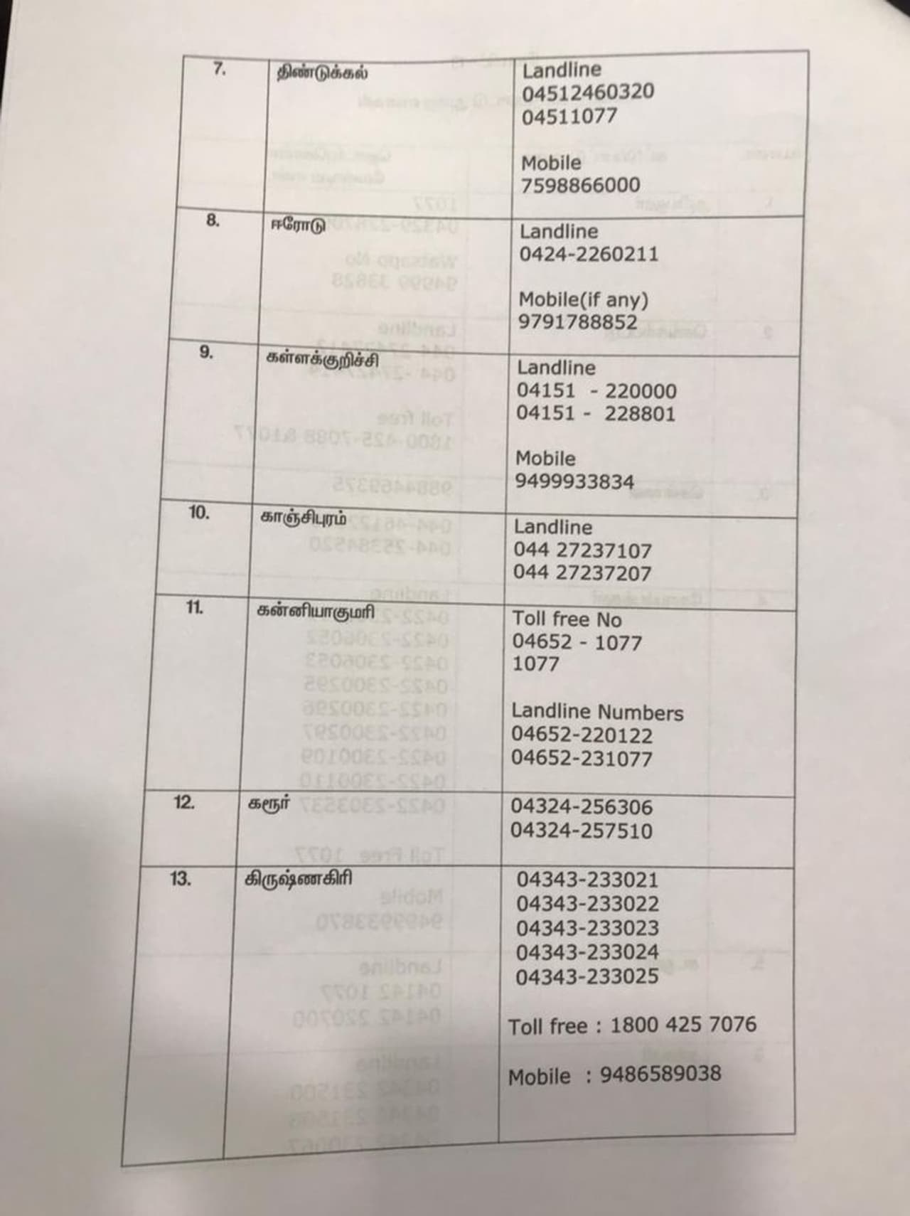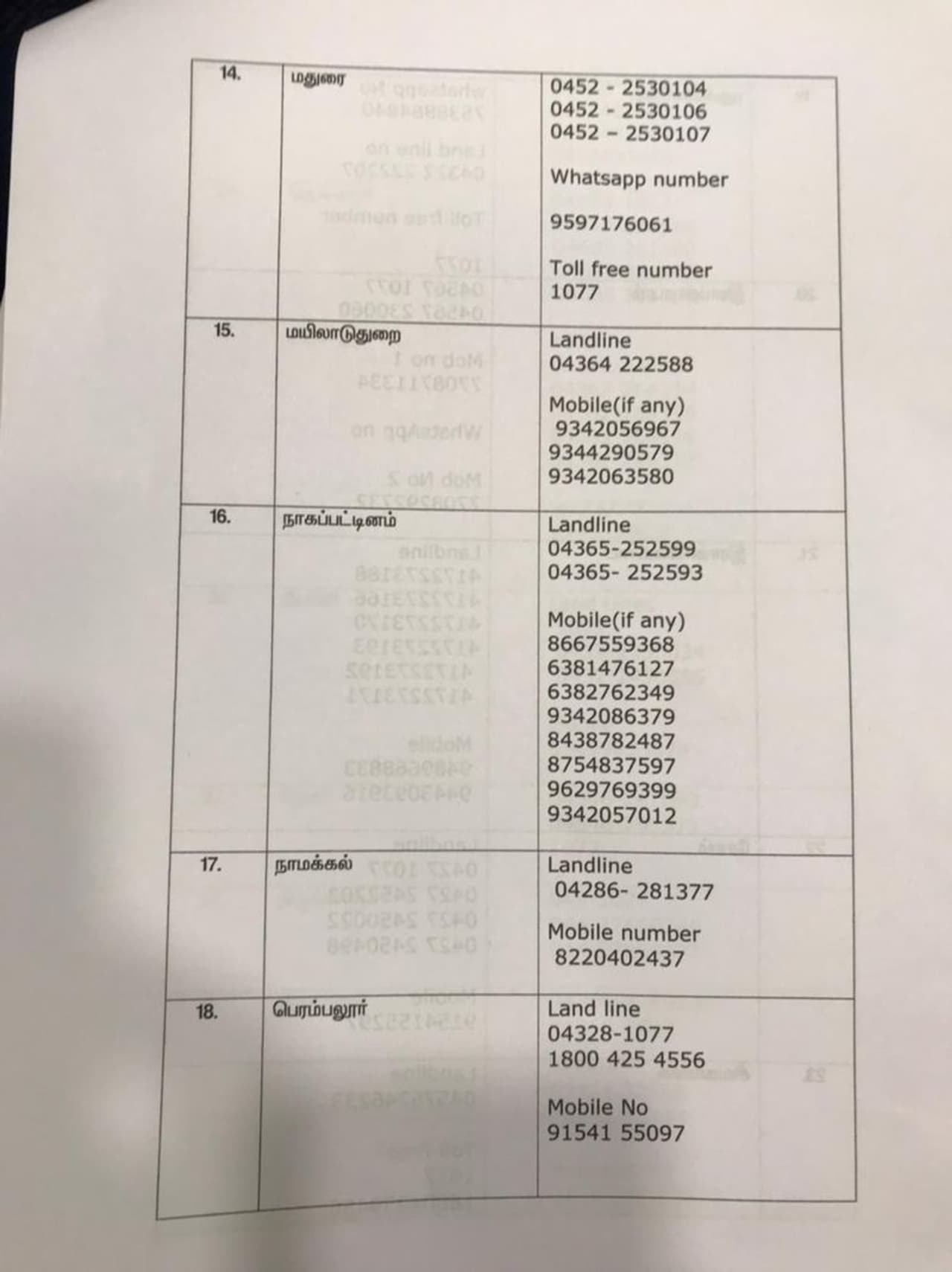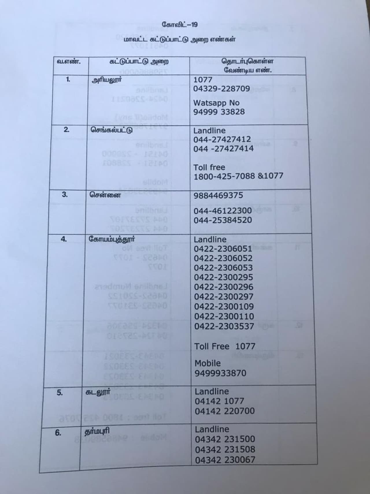 கொரோனா தடுப்பு பணிகளுக்கான வார் ரூம் அமைத்து மருந்து இருப்பு, படுக்கை வசதி, ஆக்சிஜன் இருப்பு உள்ளிட்டவை குறித்து அனைத்து மாவட்டங்களையும் ஒருங்கிணைக்கிறது. இதற்காக மாவட்டம் வாரியாக தொடர்பு எண்கள் வெளியிடப்பட்டுள்ளது அதன்படி...
