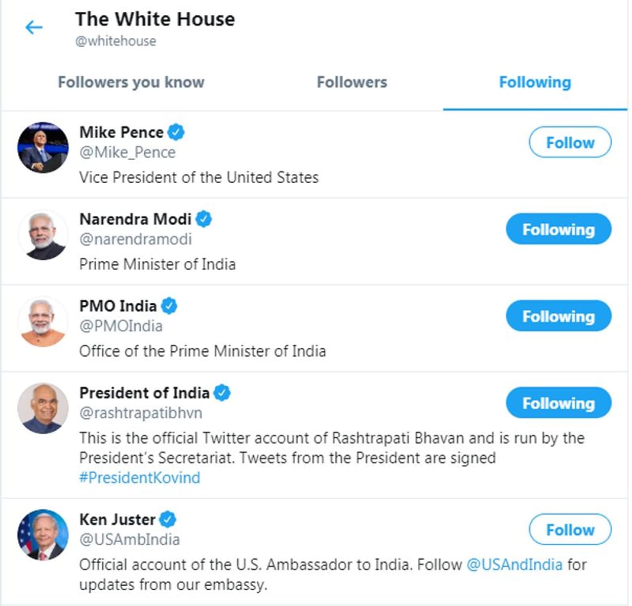 அதில் அமெரிக்க அதிபர் டிரம்ப், மெலானியா ட்ரம்ப், அதிபர் பென்ஸ் உள்ளிட்ட 16 பேர் அமெரிக்கர்கள் என்பது குறிப்பிடத்தக்கது. இவை அனைத்தும் தவிர்த்து உலக தலைவர்களில் பிரதமர் மோடியை மட்டுமே அவர்கள் பின்தொடர்கின்றனர். மேலும் குடியரசுத் தலைவர் ராம்நாத் கோவிந்த், அதன்பிறகு பிரதமர் அலுவலக கணக்குகளும் பின்தொடரப்படுகின்றன.