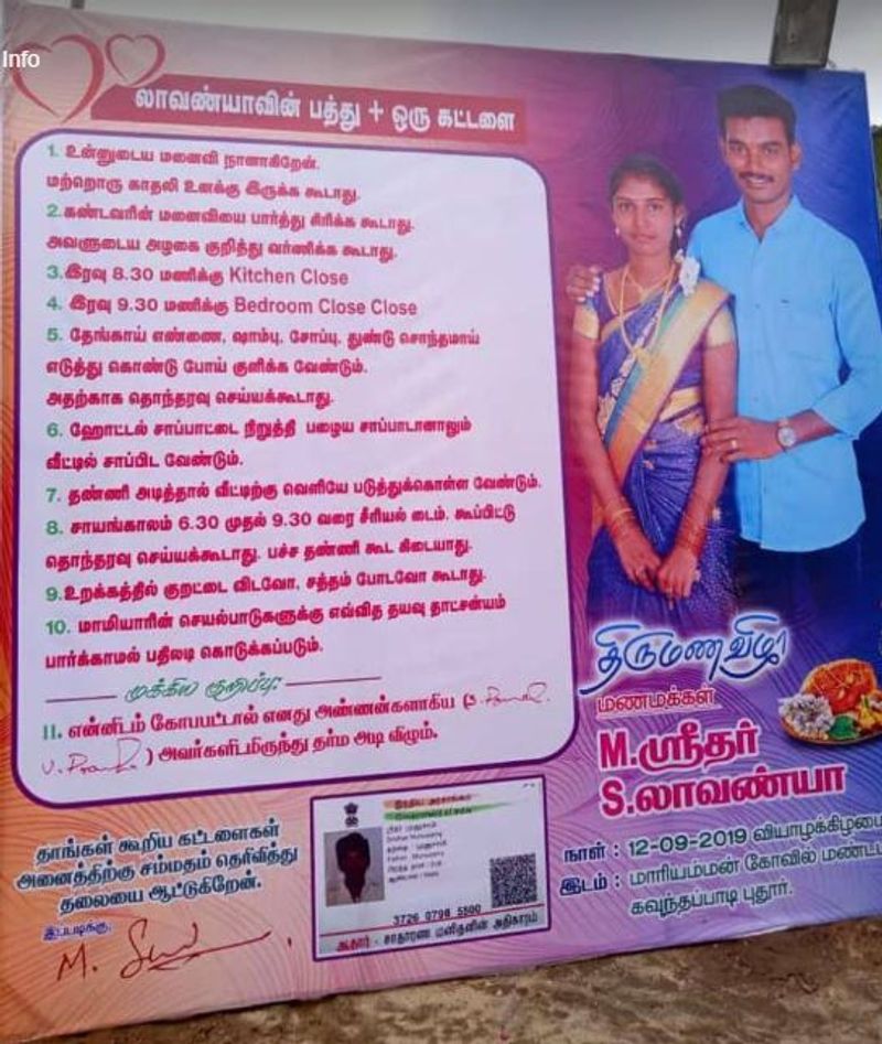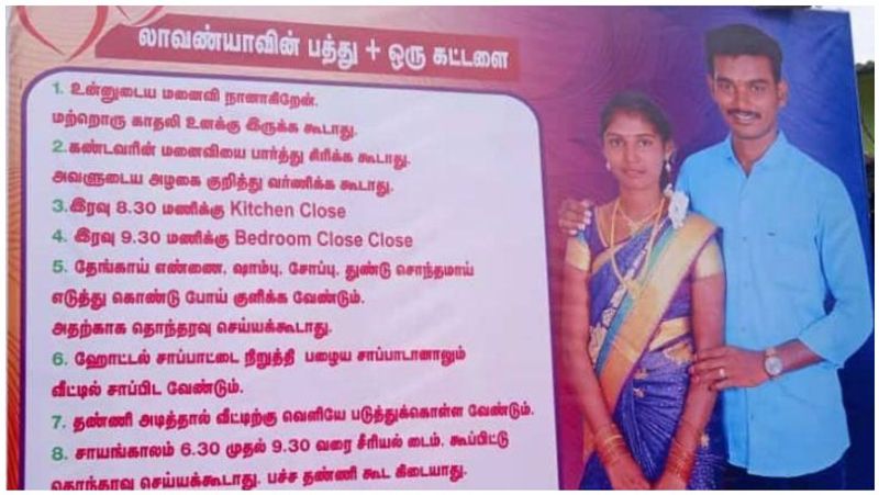 கவுந்தம்பாடி, புதூரை சேர்ந்த ஸ்ரீதரை லாவண்யா திருமணம் செய்து கொண்டார். அதற்கு அவர் விதித்துள்ள 10 கட்டளைகளை பேனர் அடித்து ஒட்டப்பட்டிருந்து. உன்னுடைய மனைவி நானாகிறேன். மற்றொரு காதலி உனக்கு இருக்கக்கூடாது. கண்டவரின் மனைவியை பார்த்து சிரிக்கக் கூடாது. அவளுடைய அழகை குறித்து வர்ணிக்கக் கூடாது. இரவு 8.30 மணிக்கு கிச்சன் க்ளோஸ். இரவு 9.30 மணிக்கு பெட்ரூம் க்ளோஸ். தேங்காய் எண்ணேய், ஷாம்பு, சோப்பு, துண்டு சொந்தமாய் எடுத்துக் கொண்டு போய் குளிக்க வேண்டும். அதற்காக தொந்தரவு செய்யக்கூடாது.