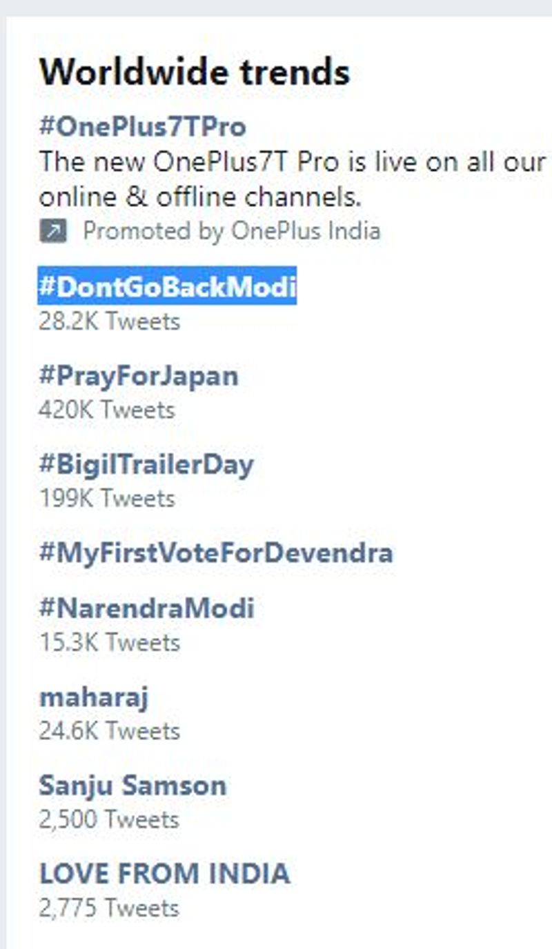 ஆனால் சீன அதிபர் உடனான சந்திப்பிற்கு மாமல்லபுரம் வருகை புரிந்த மோடிக்கு இந்த முறை இதுபோன்ற ட்ரெண்டிங் கிளம்பவில்லை. அதாவது மோடிக்கு ஆதரவு பெருகி விட்டது. அந்த வகையில் #DontGoBackModi என்ற வாசகம் தான் தற்போது ட்ரெண்டிங் இல் முதல் இடத்தை பிடித்துள்ளது என்பது குறிப்பிடத்தக்கது.
