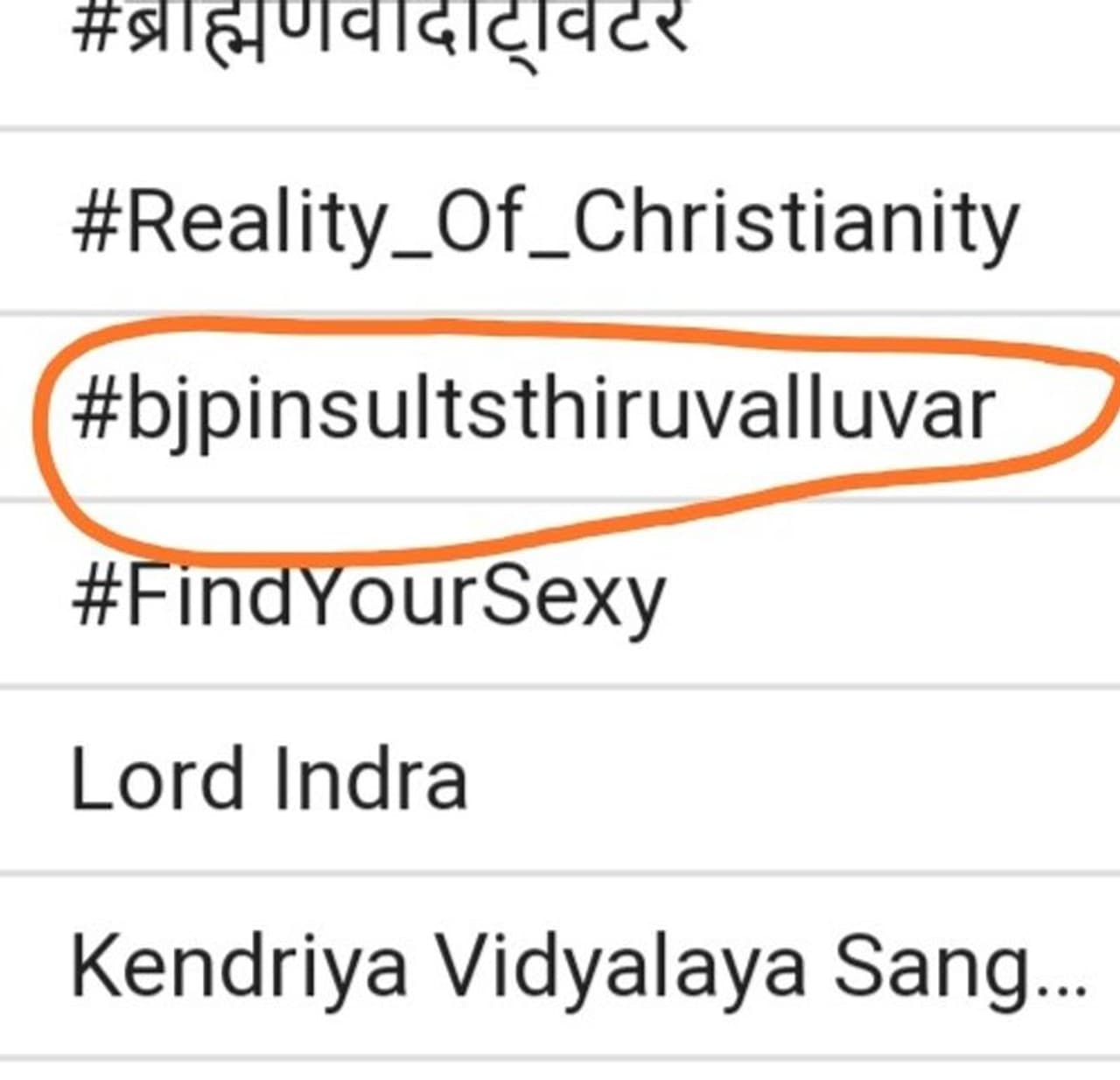 இதனிடையே சமூக ஊடகங்ளிலும் இதுதொடர்பான விவாதங்கள் சூடாக நடந்து வருகின்றன. பலர் பாஜகவை விமர்சித்து கருத்துகள் தெரிவித்துள்ளனர். இந்தநிலையில் #BJPInsultsThiruvalluvar என்கிற ஹாஸ்டேக் தற்போது இந்தியளவில் ட்ரெண்ட் ஆகியுள்ளது. அதை பல்வேறு தரப்பினரும் பதிவிட்டு வருகின்றனர்.