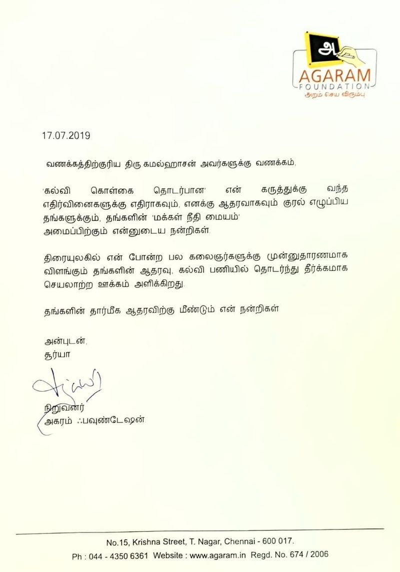 மக்கள் விழிப்படைய வேண்டும் என்கிற உங்கள் அக்கறை நல்லதுதான். ஆனால் உங்களைப்போன்ற தவறான தகவல்களை தருபவர்களிடமிருந்தும் விழிப்படைய வேண்டியது இன்னும் அவசியமானதாக இருக்கிறது, மாணவர்களுக்கு கல்வி உதவி தொகை வழங்குகிற உங்கள் பணி பாராட்டுக்குரியது. அந்த ஒரு செயலால் மட்டும் உங்களை நீங்களே கல்வியாளர் என்று நினைத்துக்கொண்டு மக்களை தவறாக திசை திருப்புவது வருத்தத்திற்கும் கண்டனத்திற்கும் உரியது’’ என சூர்யாவின் கேள்விகளுக்கு பதிலளித்துள்ளார் வானதி ஸ்ரீனிவாசன்.