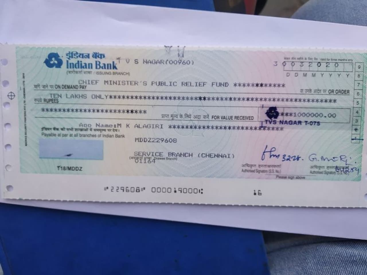 முதல்வரின் கோரிக்கையை ஏற்று கொரோனா தடுப்பு நடவடிக்கைகளுக்கு நிவாரண நிதியாக ரூ.10 லட்சத்தை முன்னாள் மத்திய அமைச்சரும், கலைஞர் கருணாநிதியின் மகனுமான மு.க.அழகிரி வழங்கியுள்ளார். இதனை மு.க.அழகிரியின் உதவியாளர் சதிஷ் மதுரை ஆட்சியர் வினயிடம் வழங்கியுள்ளார்.