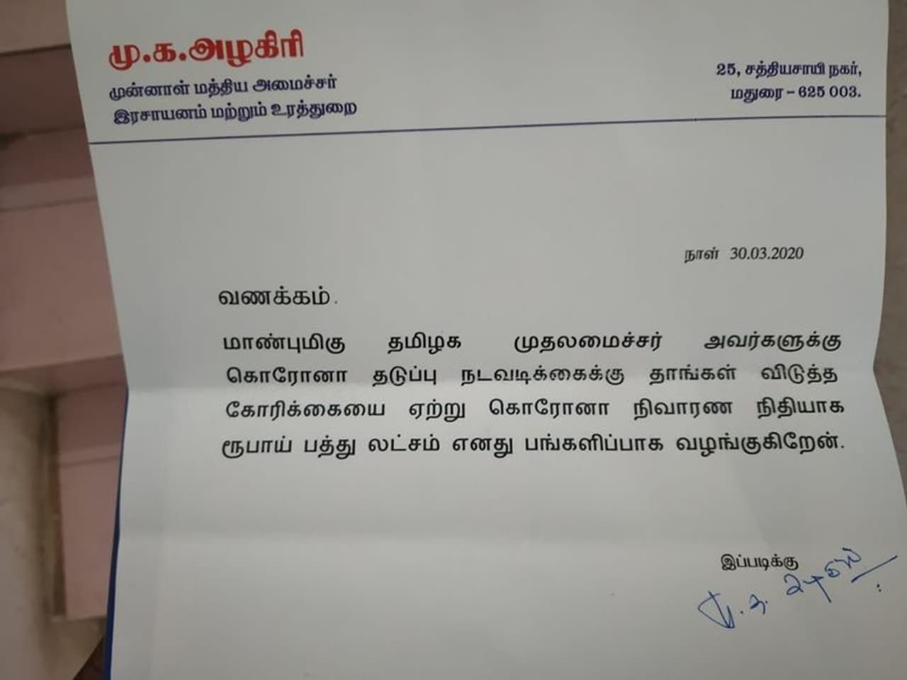 கொரோனா நிவாரண நிதியாக ரூ.10 லட்சத்தை முன்னாள் மத்திய அமைச்சர்,தென்மண்டல அமைப்புச் செயலாளருமான மு.க.அழகிரி வழங்கியுள்ளார்.