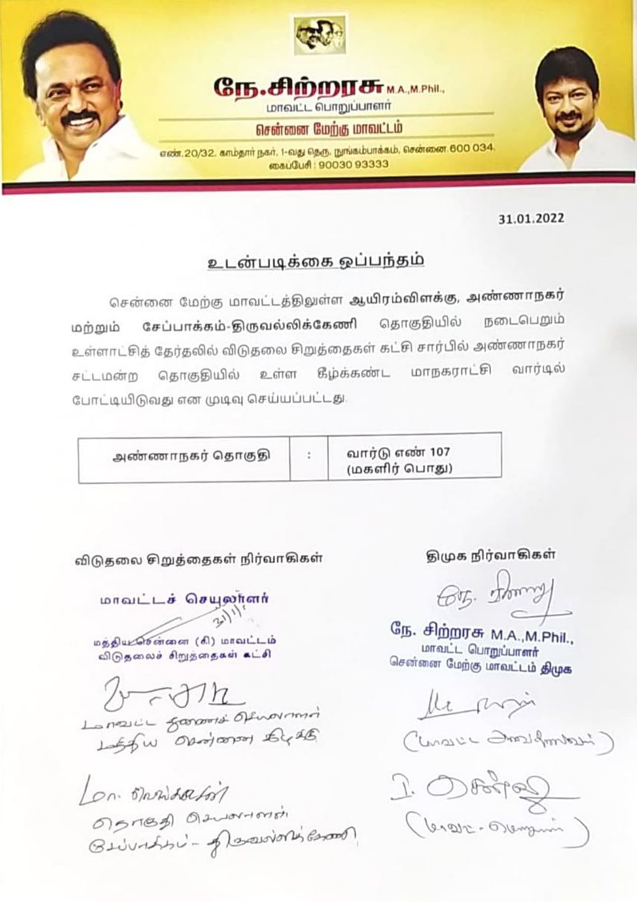 திமுக கூட்டணியில் இடம்பெற்றுள்ள விடுதலை சிறுத்தைகள் கட்சிக்கு சென்னை அண்ணாநகர் தொகுதியில் உள்ள வார்டு எண் 107 முதல் இடமாக உறுதி செய்யப்பட்டிருக்கிறது.