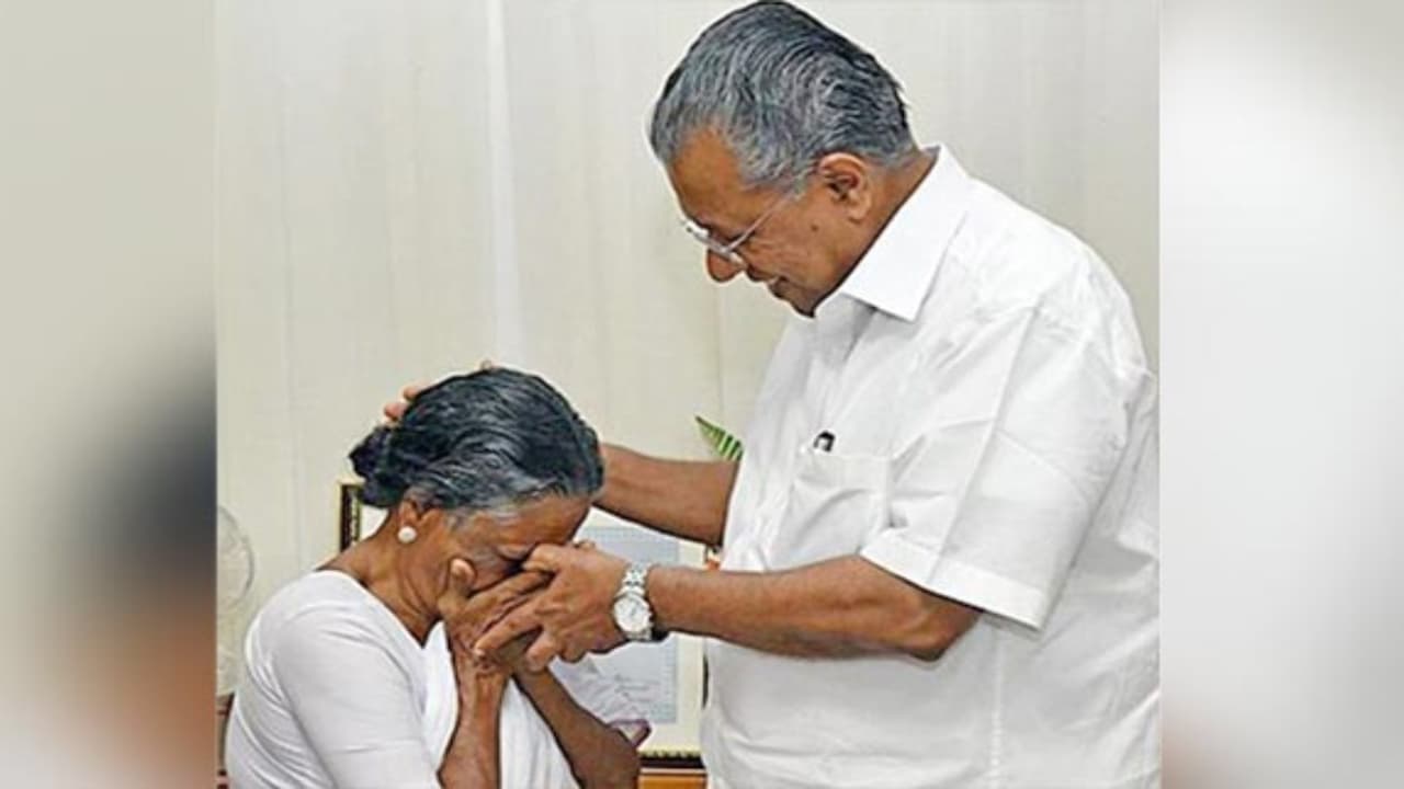 கூப்பிய கரங்களுடன் கண்ணீர் சிந்தியபடி தன்னை நோக்கி பிரபாவதி வருவதை பார்த்ததும் பினராய் விஜயன் தனது இருக்கையில் இருந்து எழுந்து வந்து பிரபாவதியின் கைகளை பிடித்தபடி அவருக்கு ஆறுதல் கூறினார்.