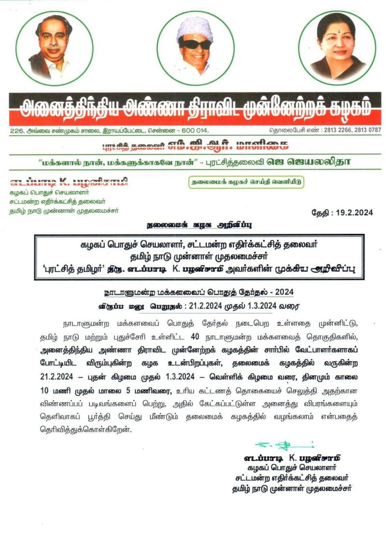 தினமும் காலை 10 மணி முதல் மாலை 5 மணிவரை, உரிய கட்டணத் தொகையைச் செலுத்தி அதற்கான விண்ணப்பப் படிவங்களைப் பெற்று, அதில் கேட்கப்பட்டுள்ள அனைத்து விபரங்களையும் தெளிவாகப் பூர்த்தி செய்து மீண்டும் தலைமைக் கழகத்தில் வழங்கலாம் என்பதைத் தெரிவித்துக்கொள்கவதாக கூறியுள்ளார். மேலும் தமிழ் நாடு மற்றும் புதுச்சேரி உள்ளிட்ட 40 நாடாளுமன்ற மக்களவைத் தொகுதிகளில், அனைத்திந்திய அண்ணா திராவிட முன்னேற்றக் கழகத்தின் சார்பில் வேட்பாளர்களாகப் போட்டியிட விரும்புகின்ற கழக உடன்பிறப்புகள், பொதுத்தொகுதிக்கு 20ஆயிரமும், தனி தொகுதிக்கு 15ஆயிரம் நிர்ணயிக்கப்பட்டுள்ளதாகவும் தெரிவிக்கப்பட்டுள்ளது.