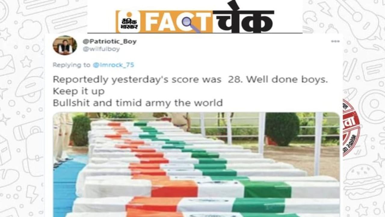 இந்திய சீன எல்லையில் பேச்சுவார்த்தை மூலம் பதற்றம் ஒரளவுக்கு கட்டுக்குள் வந்துள்ள நிலையில், தற்போது இந்தோ பாக் எல்லையில் ஏற்பட்ட மோதலில் 28 இந்திய வீரர்கள் கொல்லப்பட்டதாக சமூக ஊடகங்களில் ஒரு தகவல் காட்டுத்தீயாய் பரவி வருகிறது.அதை உறுதி செய்யும் வகையில் ஒரு புகைப்படமும் அதில் இணைக்கப்பட்டுள்ளது.பெரும்பாலும் பாகிஸ்தானை சேர்ந்தவர்கள் இந்த புகைப்படத்தை பகிர்ந்து வருகின்றனர்.