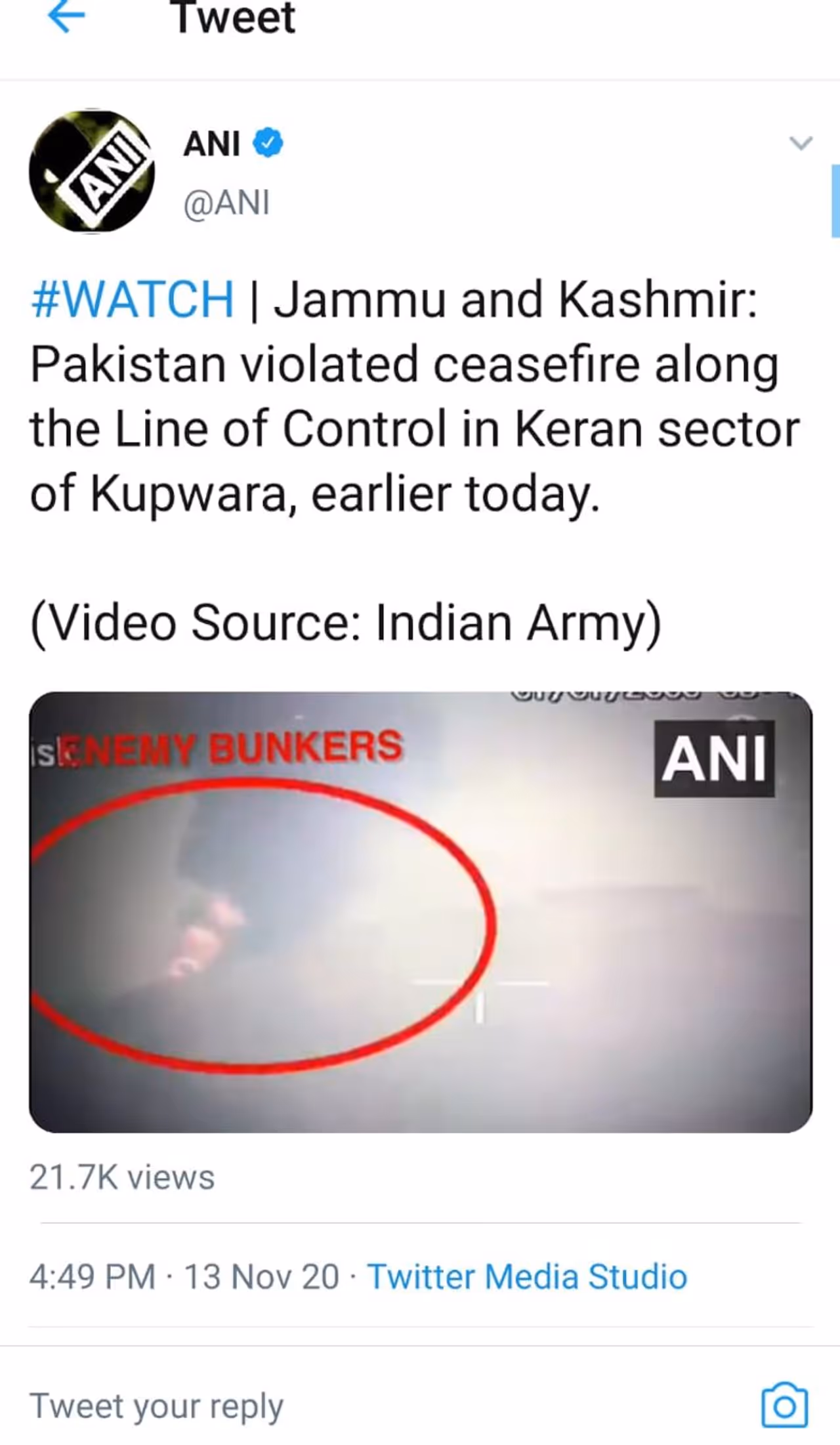 நவம்பர் 13ஆம் தேதி ஜம்மு காஷ்மீரில் போர் நிறுத்த ஒப்பந்தத்தை பாகிஸ்தான் மீறியதாக செய்தி நிறுவனமான ஏ.என்.ஐ தெரிவித்திருந்தது. ஆனால் அதில் இந்திய வீரர்கள் உயிரிழந்தது குறித்து எந்த தகவலும் இல்லை. அதே நேரத்தில் இதை உறுதி செய்யும் வகையில் பாதுகாப்பு துறையில் இருந்தும், ராணுவ வட்டாரத்திலிருந்தும் எந்த தகவலும் இல்லை. நவம்பர் 13ஆம் தேதி ஜம்மு காஷ்மீரின் பூஞ்ச்,கெரான்,குரேஸ் எல்லையில் பாகிஸ்தான் ராணுவம் போர் நிறுத்த ஒப்பந்தங்களை மீறி இந்திய படைகளின் மீது துப்பாக்கிச் சூடு நடத்தியது.