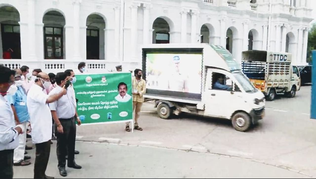 பெருநகர சென்னை மாநகராட்சிக்குட்பட்ட பகுதிகளில் கொரோனா வைரஸ் தொற்று குறித்து விழிப்புணர்வு ஏற்படுத்தும் அதிநவீன மின்னணு வீடியோ விழிப்புணர்வு வாகனங்களை சென்னை மாநகராட்சி ஆணையர் பிரகாஷ் அவர்கள் இன்று துவக்கி வைத்தார். தமிழக முதலமைச்சர் அவர்களின் உத்தரவின்படி மாநகராட்சிக்குட்பட்ட பகுதிகளில் பொதுமக்களிடையே கொரோனா வைரஸ் தொற்று தடுப்பு மற்றும் பாதுகாப்பு குறித்த விழிப்புணர்வை ஏற்படுத்தும் அதிநவீன மின்னணு (LED) வீடியோ விழிப்புணர்வு வாகனங்களை பிரகாஷ் இன்று ரிப்பன் மாளிகையில் இருந்து கொடியசைத்து துவக்கி வைத்தார். பின்னர் செய்தியாளர்களை சந்தித்த அவர் கூறியதாவது:- தமிழக முதலமைச்சர் அவர்களின் ஆலோசனையின்படி பெருநகர சென்னை மாநகராட்சியின் சார்பில் கொரோனா வைரஸ் தொற்றை கட்டுப்படுத்த பல்வேறு பாதுகாப்பு மற்றும் தடுப்பு நடவடிக்கைகள் மேற்கொள்ளப்பட்டு வருகின்றன. பெருநகர சென்னை மாநகராட்சிக்குட்பட்ட பகுதிகளில் கொரோனா வைரஸ் தொற்று கட்டுப்படுத்தப்பட்டு நோய்த்தொற்று விகிதம் குறைந்து வருகிறது.