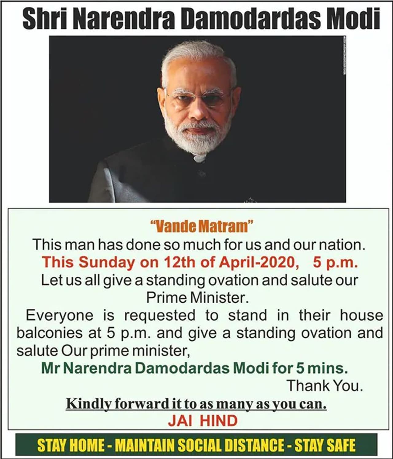 தன்னை கவுரவிக்க அனைவரும் பால்கனியில் 5 நிமிடம் எழுந்து நில்லுங்கள் என்று வைரலாகும் போஸ்டரை குறிப்பிட்டு பிரதமர் நரேந்திர மோடி, தன்னை சர்ச்சையில் சிக்க வைப்பதற்கான முயற்சியாக தோன்றுவதாக கூறியுள்ளார். மேலும், தன்மீதுள்ள அன்பை வெளிப்படுத்த வேண்டும் என்று நினைத்தால், கொரோனா நெருக்கடி காலத்தில் ஏழை குடும்பத்திற்கு உதவுங்கள் என்று அவர் வலியுறுத்தியுள்ளார்.