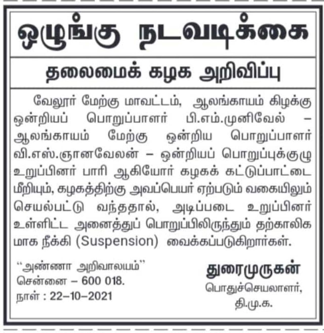 இது தொடர்பாக திமுகவின் அதிகாரப்பூர்வ நாளேடான முரசொலியில்;- ஒன்றிய கவுன்சிலரான எதிரணி வேட்பாளர் ரஞ்சித்குமார், அவரின் தந்தை சக்கரவர்த்தி, குடியாத்தம் மேற்கு ஒன்றியச் செயலாளர் (பொறுப்பு) கள்ளூர் ரவி, குடியாத்தம் தெற்கு ஒன்றியச் செயலாளரும், மாவட்ட கவுன்சிலருமான கிருஷ்ணமூர்த்தி, குடியாத்தம் கிழக்கு ஒன்றியத் துணைச் செயலாளர் மனோஜ், மாவட்ட மாணவரணி துணை அமைப்பாளர் சத்தியமூர்த்தி ஆகியோர் கழக கட்டுப்பாட்டை மீறியும், கழகத்திற்கு அவப்பெயர் ஏற்படும் வகையிலும் செயல்பட்டு வந்ததால் அடிப்படிடை உறுப்பினர் உள்ளிட்ட அனைத்து பொறுப்பிலிருந்தும் தற்காலிகமாக நீக்கிவைக்கப்படுவதாக பொதுச்செயலாளர் துரைமுருகன் அறிவித்துள்ளார். நீக்கப்பட்டவர்கள் திமுகவின் பொதுச்செயலாளர் துரைமுருகனின் மகன் கதிர் ஆனந்த் எம்பிக்கு ஆதரவாக செயல்பட்டவர்கள்தான் என்பது குறிப்பிடத்தக்கது.