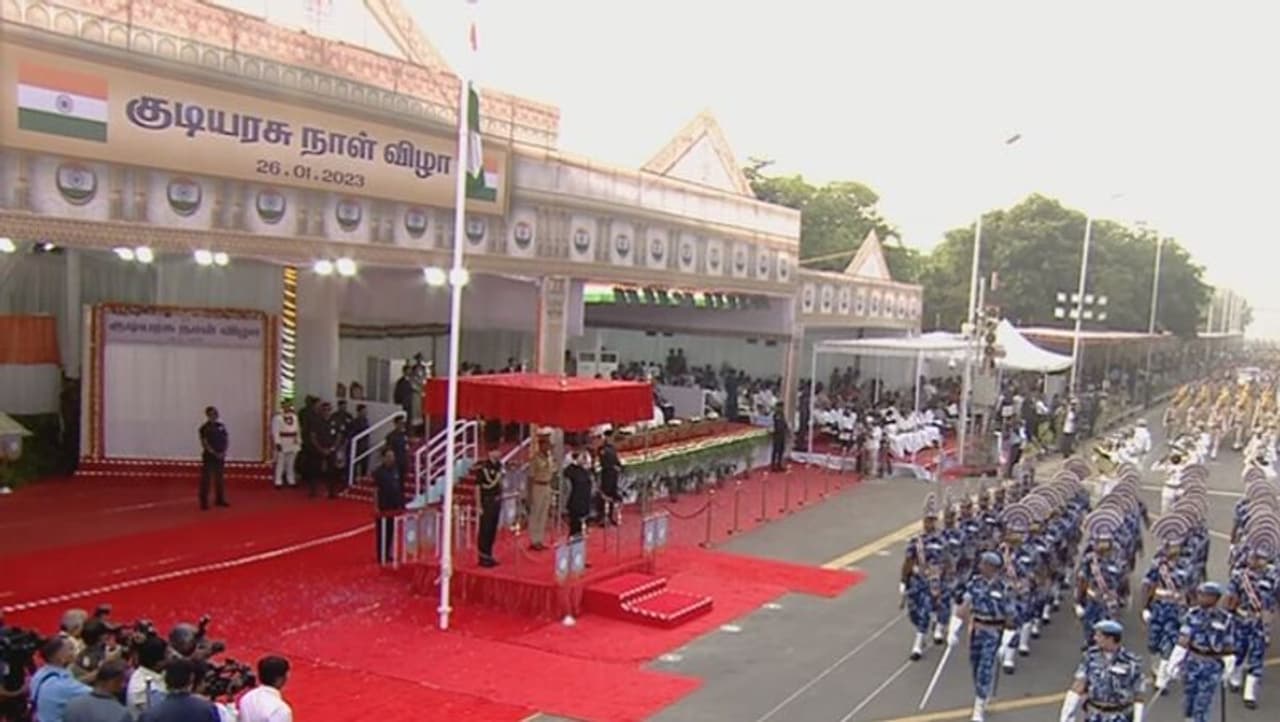 இந்தியாவின் 74-வது குடியரசு தினத்தை முன்னிட்டு சென்னை மெரினா கடற்கரையில் ஆளுநர் ஆர்.என்.ரவி தேசிய கொடியை ஏற்றிவைத்து முப்படை மற்றும் தமிழக காவல் உள்ளிட்ட சீருடை படையினரின் அணிவகுப்பு மரியாதையை ஏற்றுக்கொண்டார்.